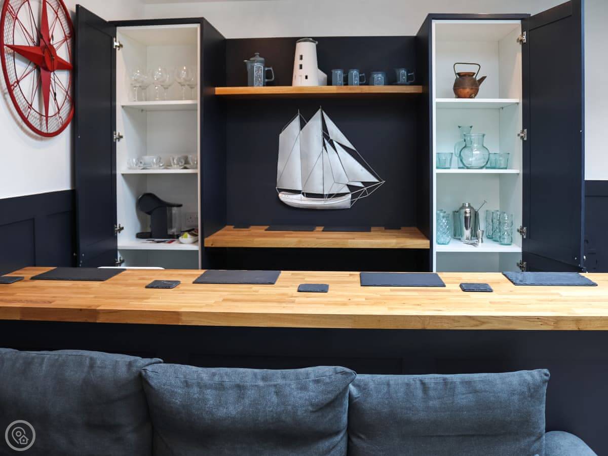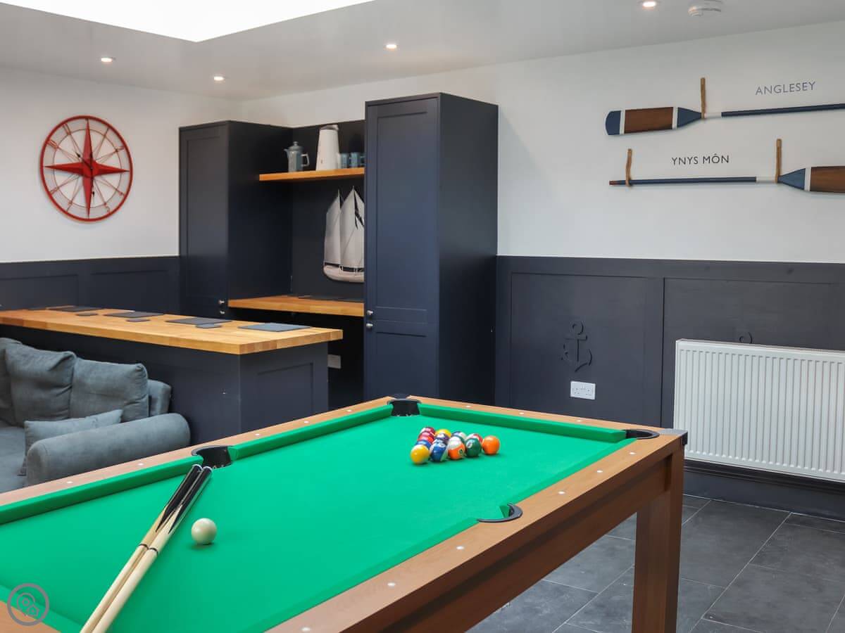 Downstairs, there's a big kitchen and dining area for everyone to be together. Then there's a separate living room with a wood burner. Upstairs, there's a second sitting room. That one's got a bar area and a games table. It's a good spot if people want to split up in the evening.