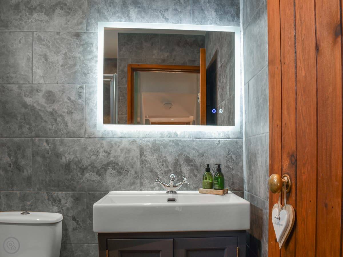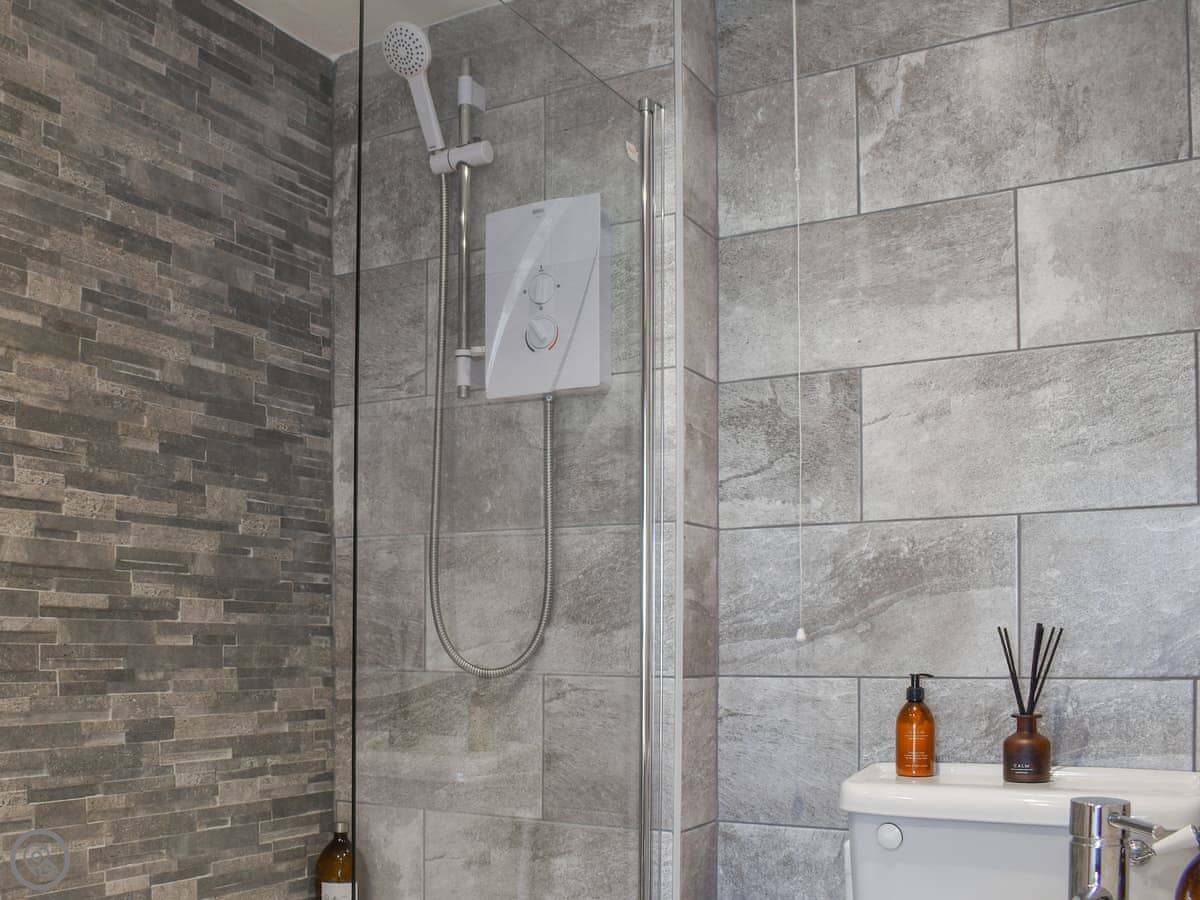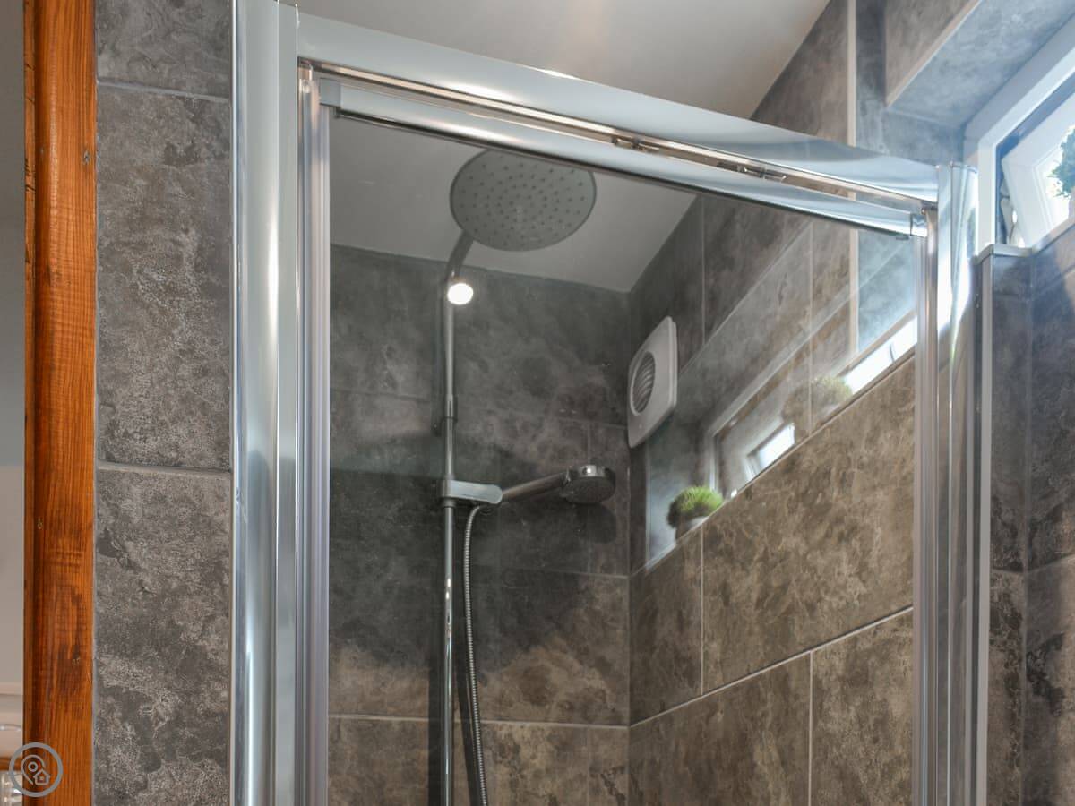 It sleeps six over three bedrooms. Two are downstairs, one has an en-suite shower. There's also a main bathroom down there. Upstairs is the living area, kitchen, and dining space. The stairs up are quite steep.