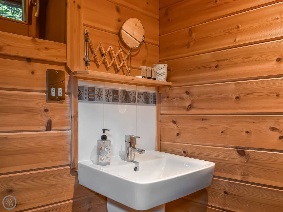 There's parking right next to the cabin. It's all on one level from the parking area to the front door, with a ramp. The doors are wide. A wheelchair user could get in, but the internal layout and stairs mean it wouldn't be fully accessible for moving around inside.