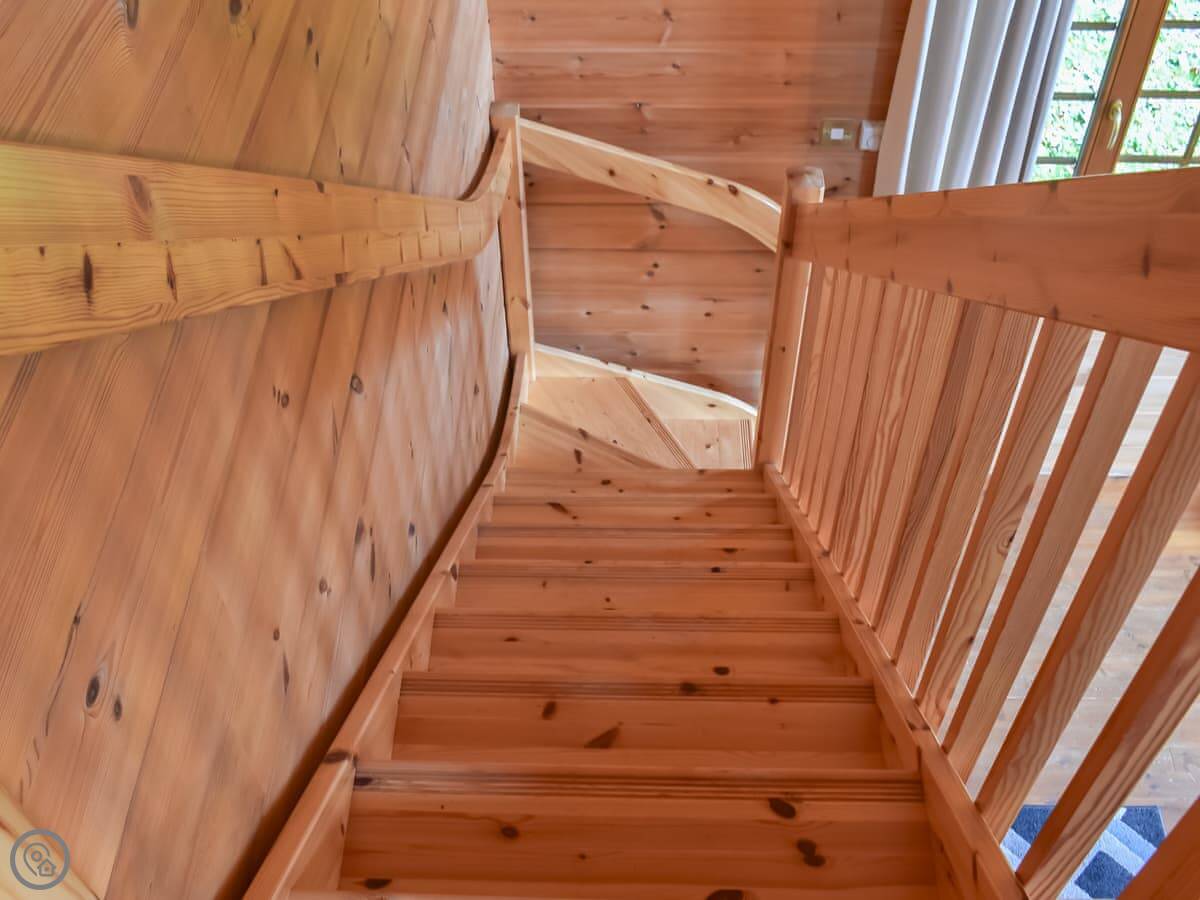 The stairs up to the mezzanine and master bedroom are ship's ladder style. They're steep and open-tread, so they're not suitable for very young children or anyone unsteady on their feet.