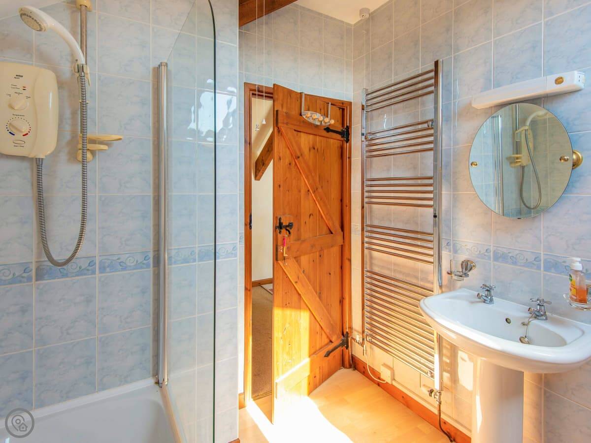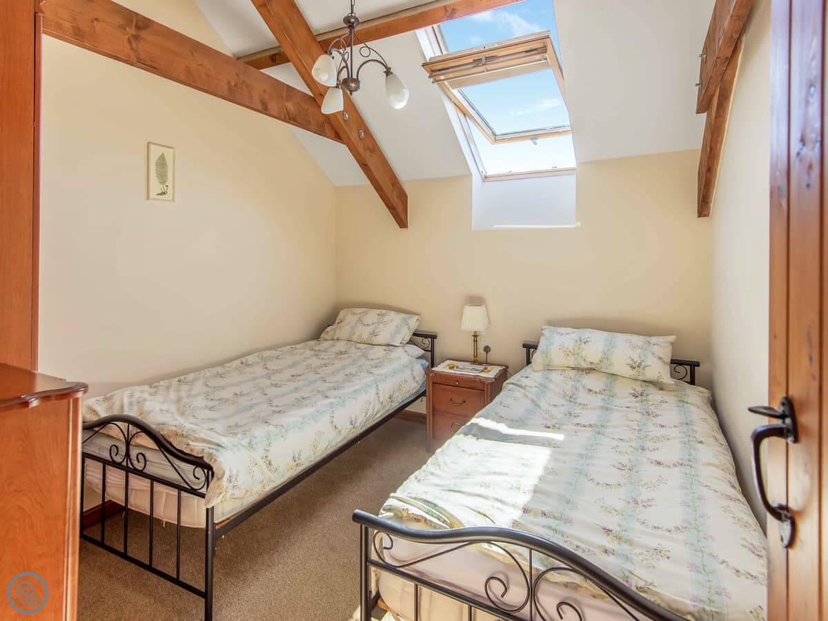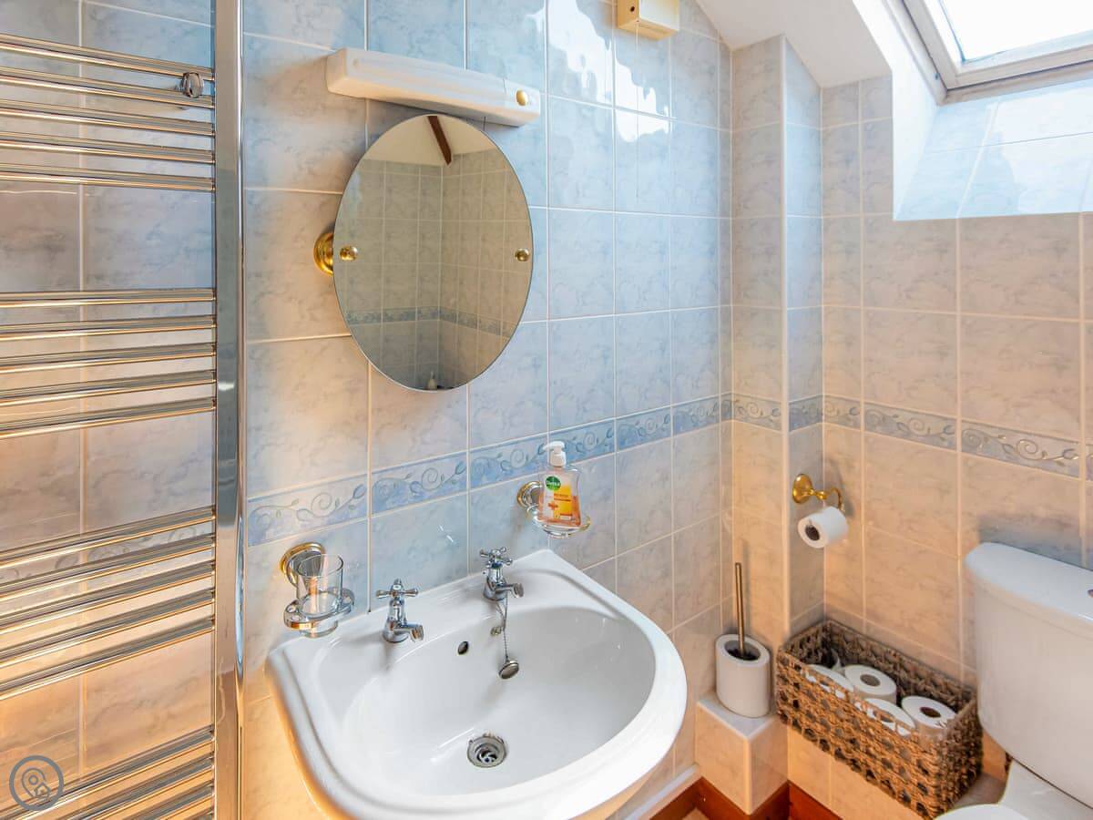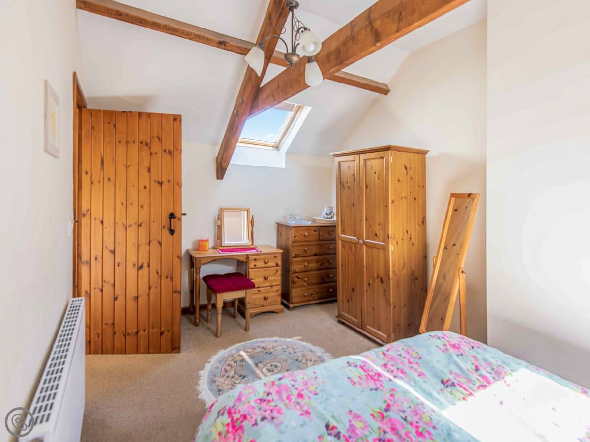 It sleeps four. Two bedrooms upstairs, one double and one with twin beds. They both have Velux windows in the roof. The bathroom is upstairs too, it's tiled and has a shower over the bath. There's another toilet downstairs.