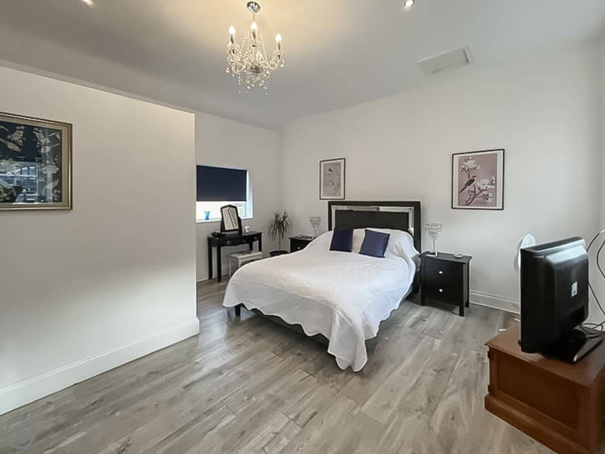 It's for two people. It's a one bedroom apartment, so the bedroom is off the living area. The bed is a king size. The bathroom is ensuite, and it has a full bath with a shower over it.