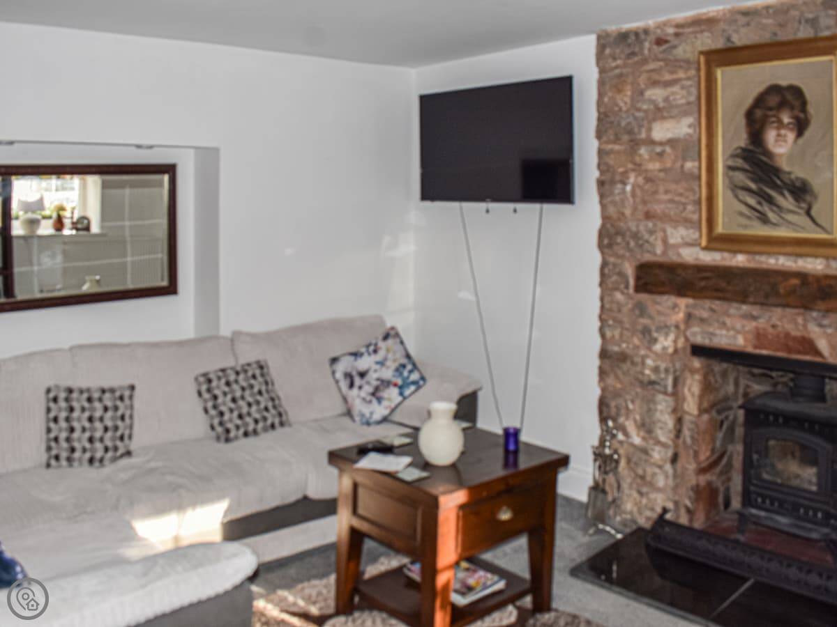The stairs up to it are a bit steep and narrow, just to mention it. Inside, it's an open plan kitchen and living room. There's a wood burner and a smart TV. The kitchen has what you need for cooking.