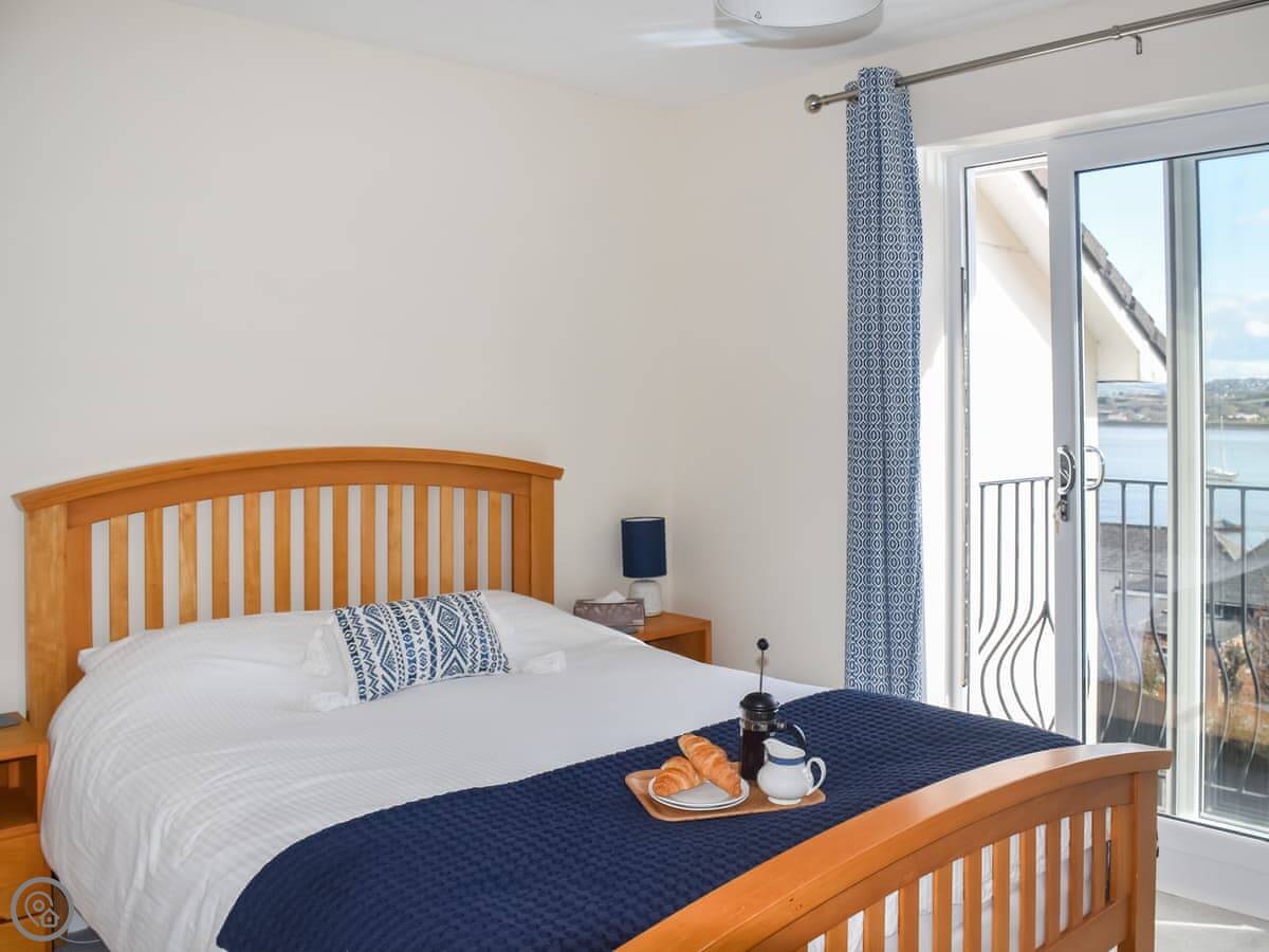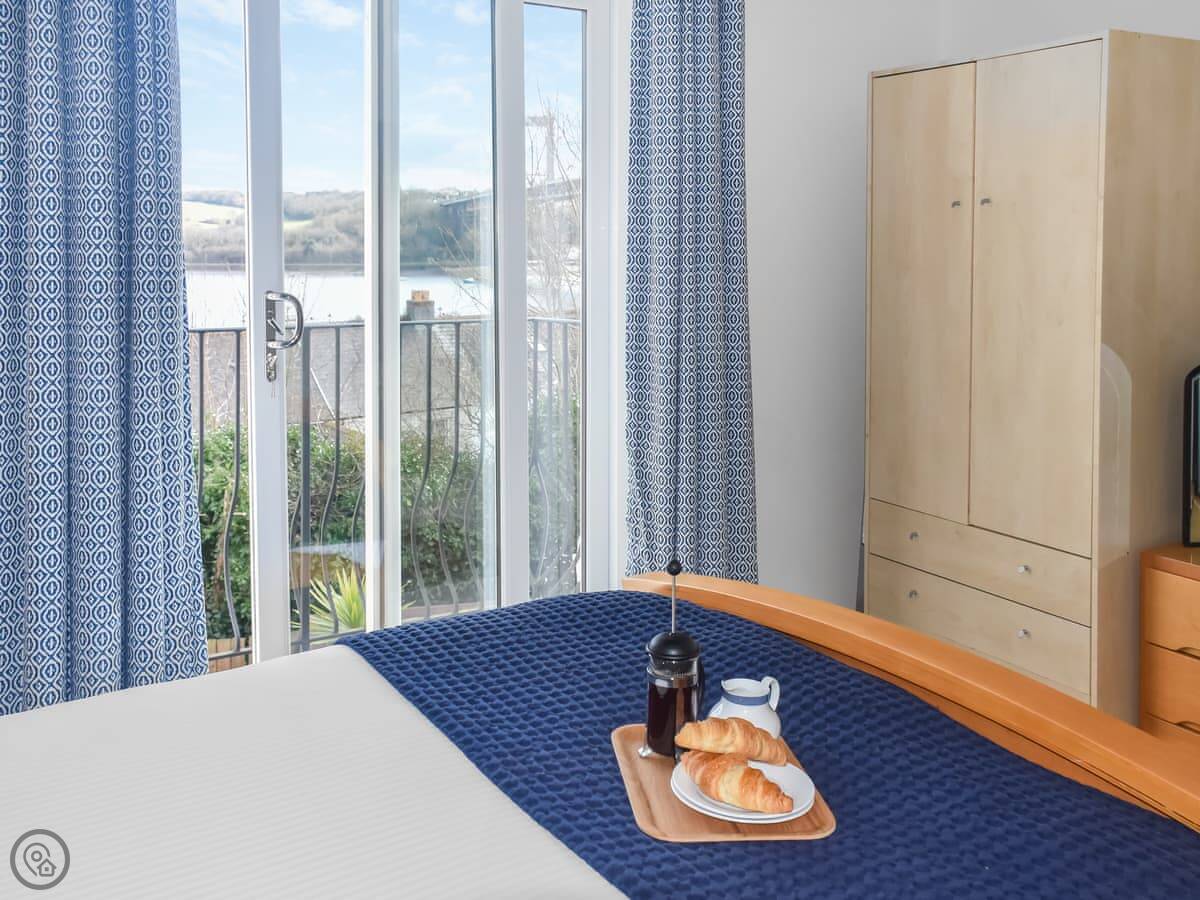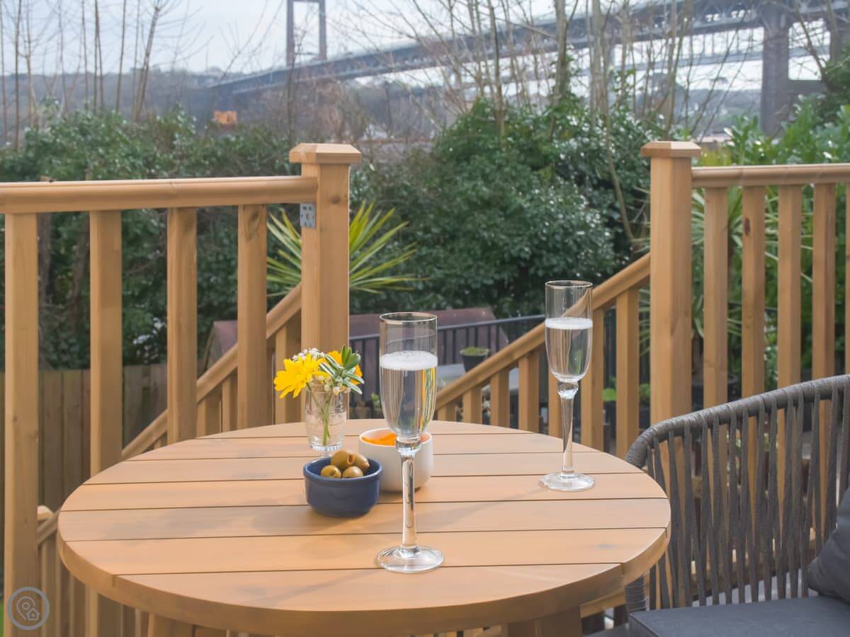 It sleeps two. One bedroom, one bathroom. It's got a 4 Star rating so it's comfortable and well looked after. The bedroom is upstairs. You can walk out from there onto a small balcony. The living area has big sliding doors that open onto a decked garden. You look straight out over the River Tamar and the bridge. It's a good view.