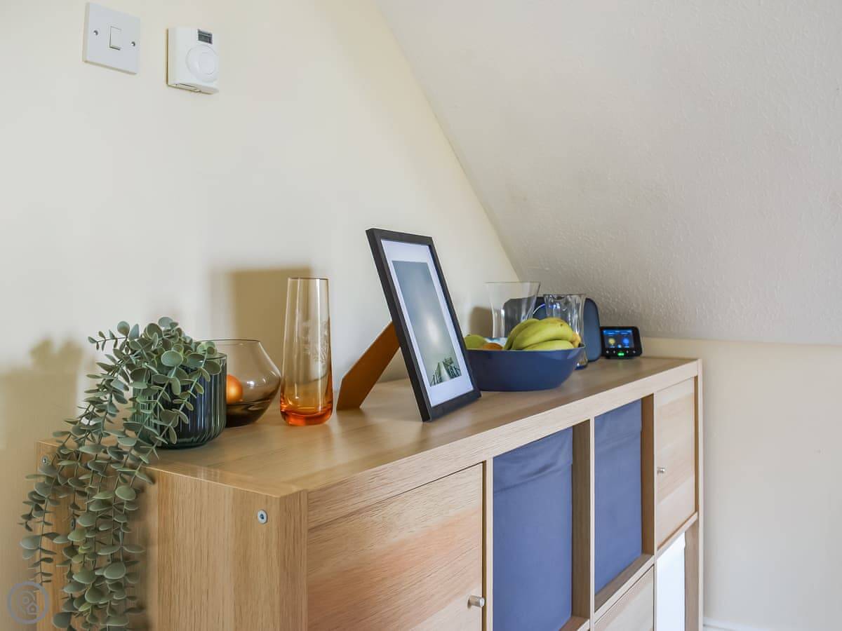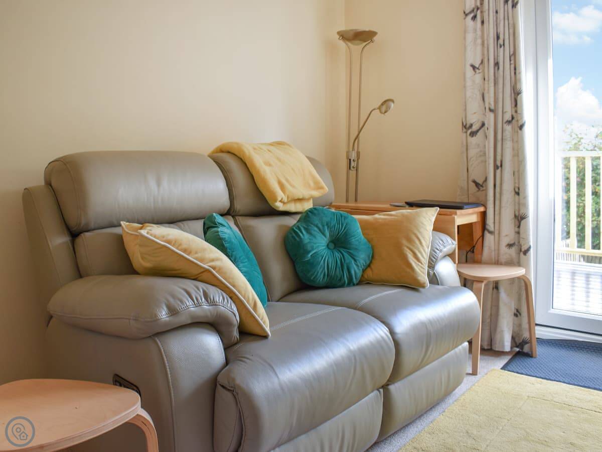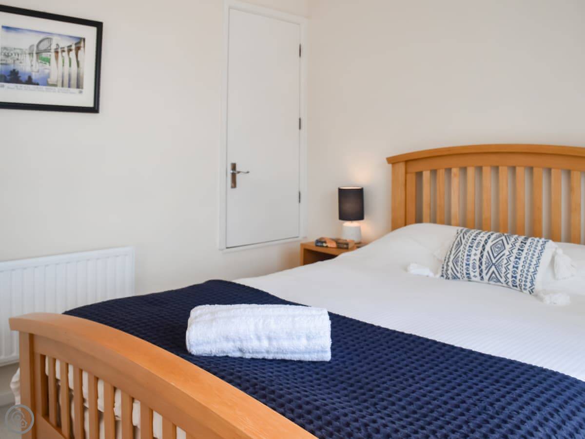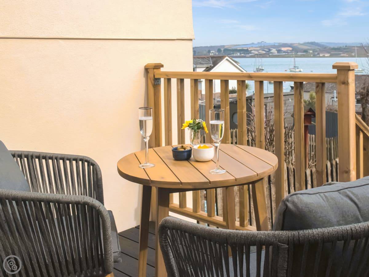 It sleeps two. One bedroom, one bathroom. It's got a 4 Star rating so it's comfortable and well looked after. The bedroom is upstairs. You can walk out from there onto a small balcony. The living area has big sliding doors that open onto a decked garden. You look straight out over the River Tamar and the bridge. It's a good view.