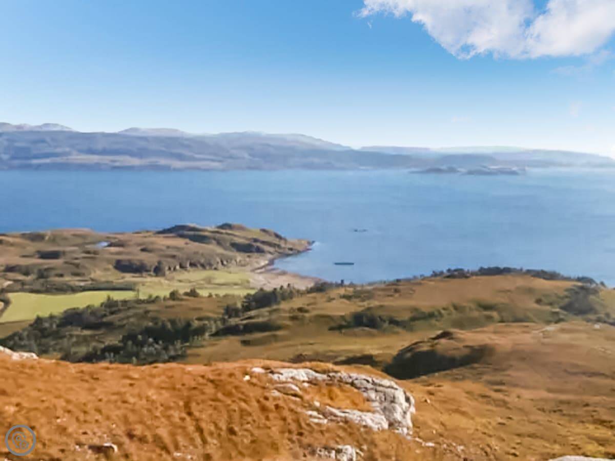 Outside, there's a firepit and some garden furniture. The view is fields and hills. You're a mile from the shore of Loch Linnhe, so you can walk down there. For a sandy beach, you'd drive a bit further.