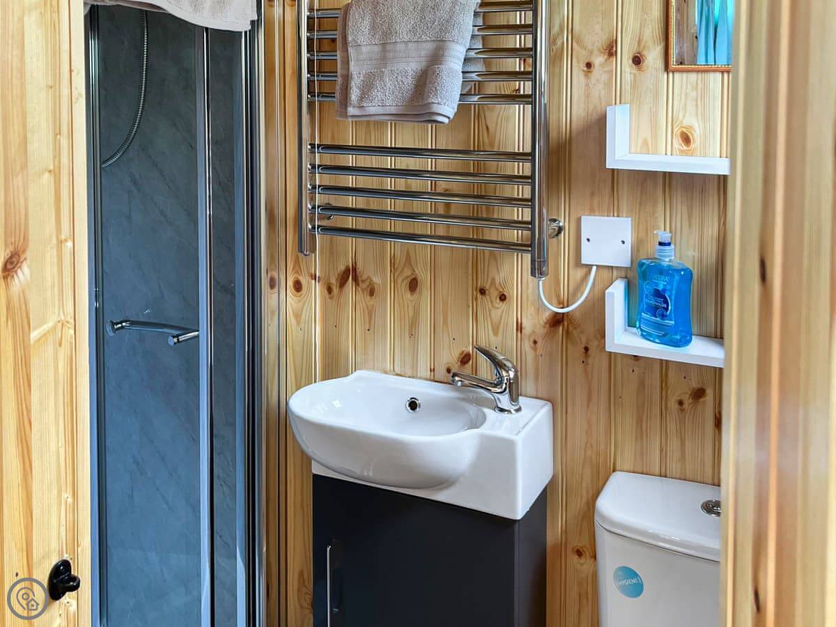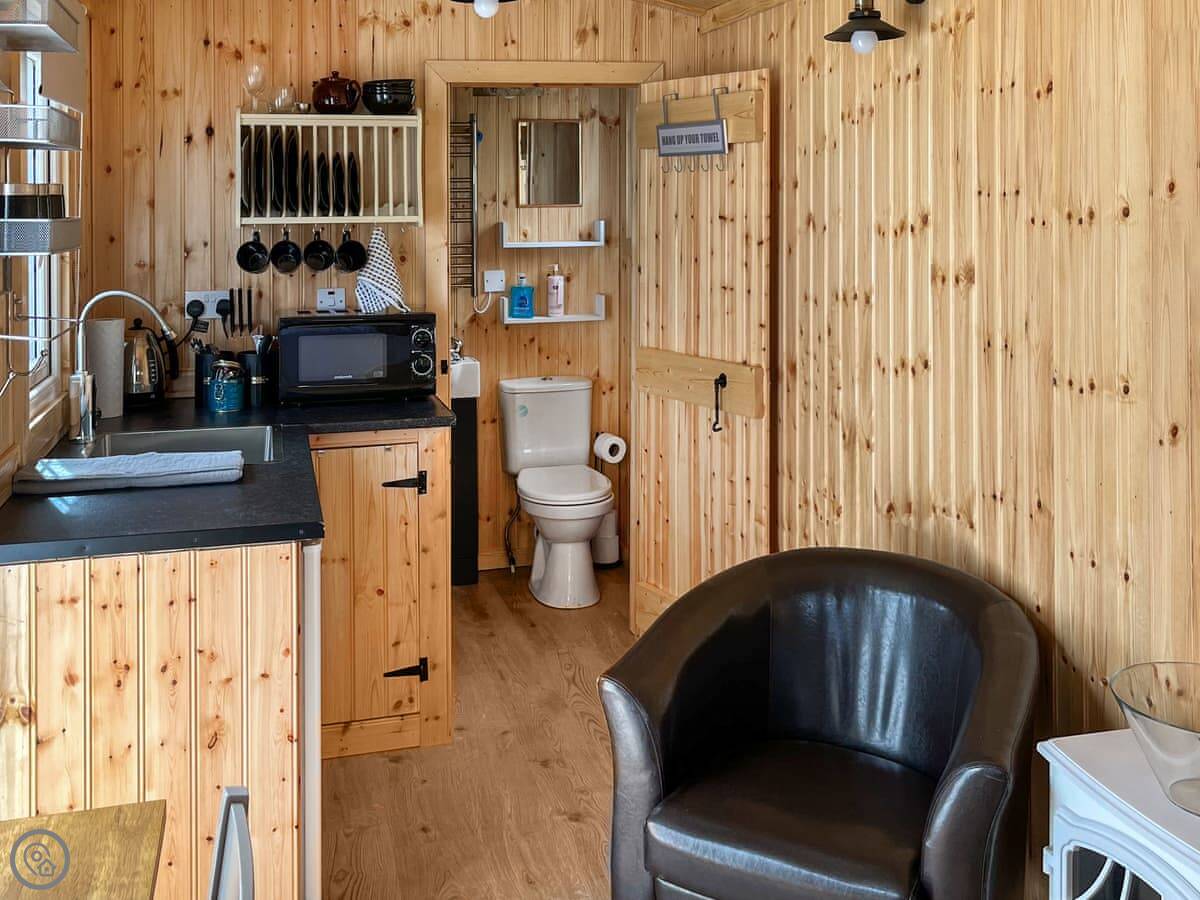 It's open plan inside. One room with the bed, a small kitchen area, a table and chairs, and an electric stove that looks like a wood burner. There's a separate shower room. It's got a 3 Star rating, which means it's clean and has what you need, but it's basic. The WiFi works, but it's a farm in the Highlands, so don't expect to stream films all night.
