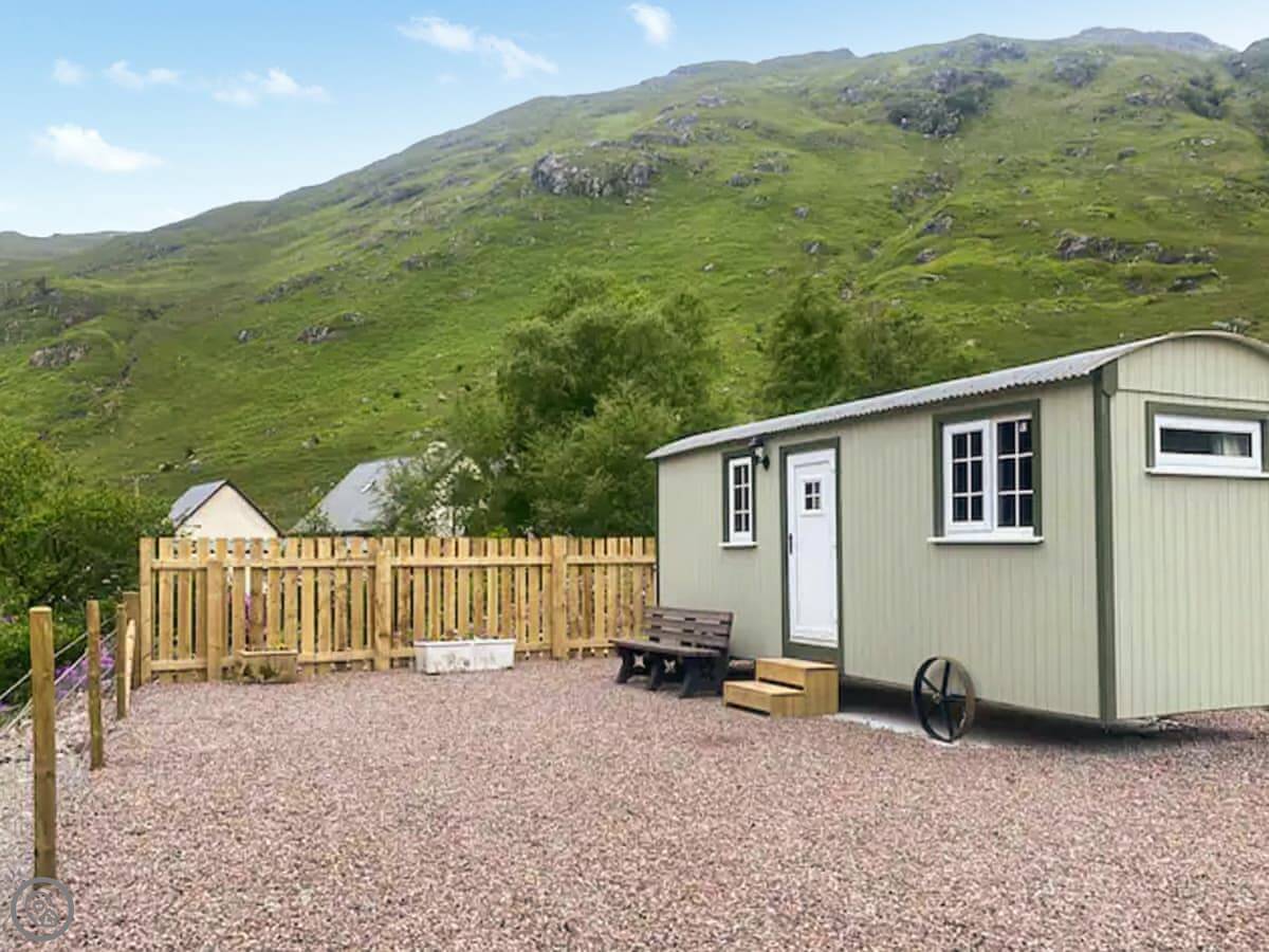 Shepherds Cabin is a small, detached place up at Kingairloch. It's glamping, really. You're on the working farm here, so you'll see sheep and maybe the farmer going about his day. The cabin is just for two people.
