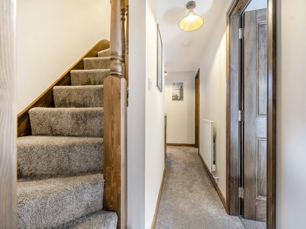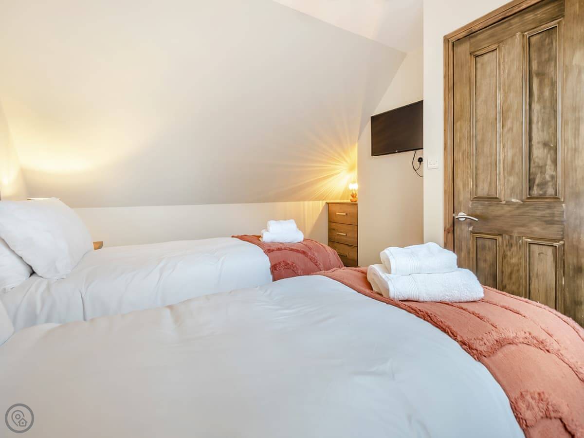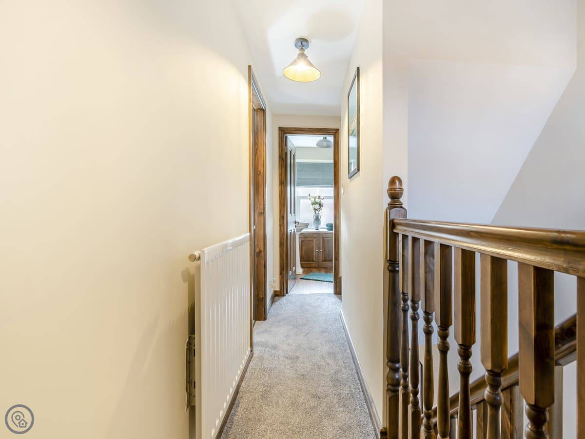 It's a terraced cottage, done up recently. Sleeps six. Three bedrooms and one bathroom. The main bedroom is on the top floor. The bed can be made up as a super king or twins. That's handy. The stairs are a bit steep and twisty, so watch your head.