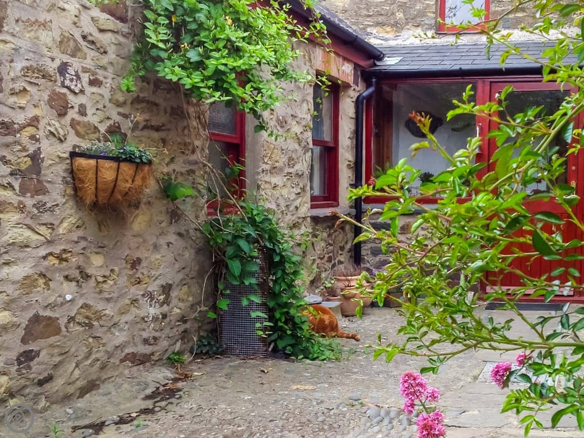The name means 'the boy's shed', which fits. It's cosy. The floor downstairs is original flagstone, and there are stone walls. It keeps things cool in summer. There's a kitchen area, a table, and a sofa by the window. Upstairs is the double bed and another small sofa. The stairs are quite steep, just so you know.