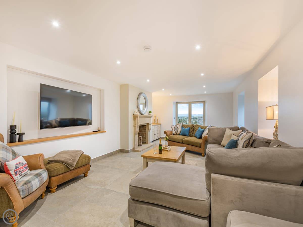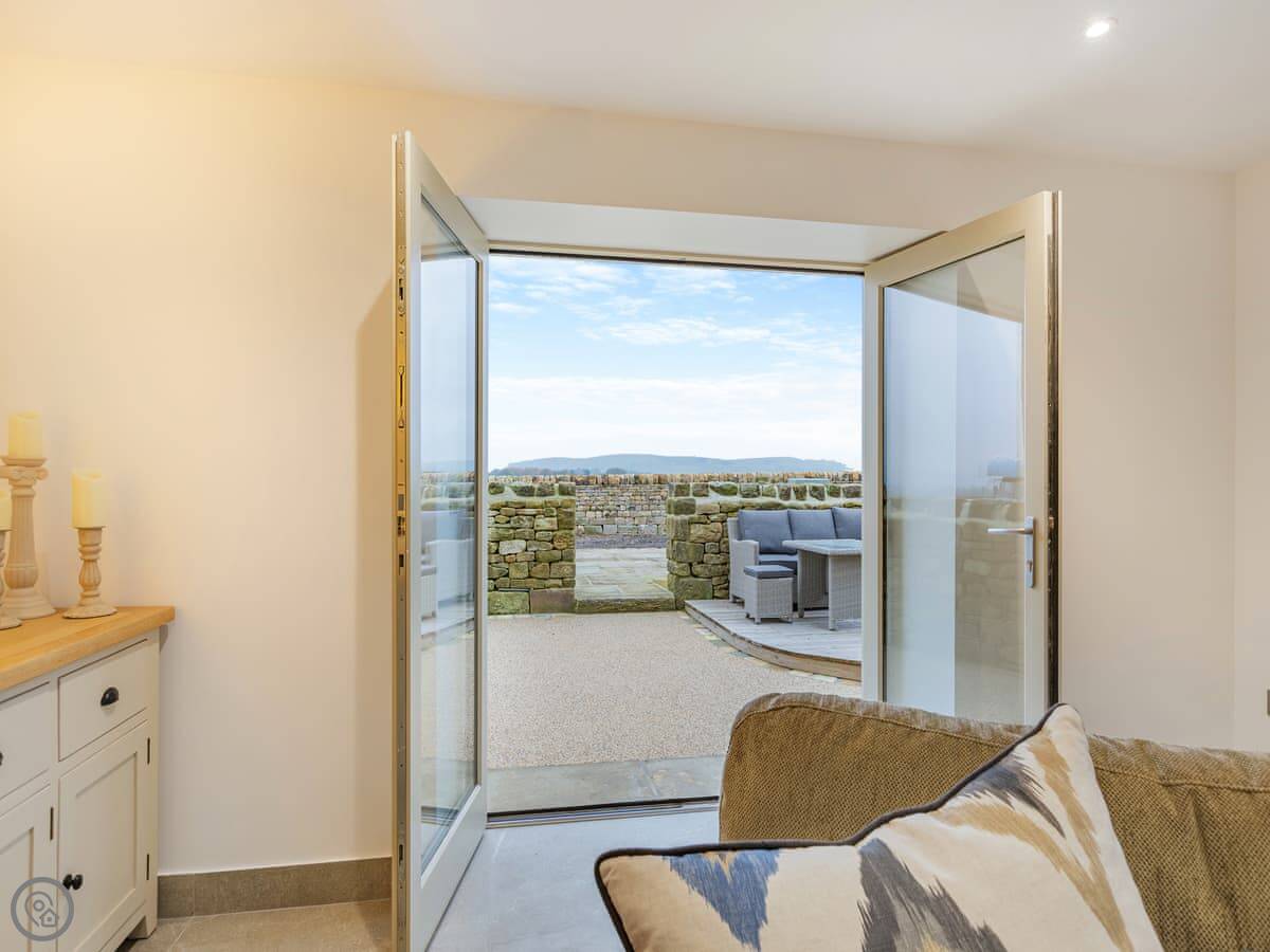 Outside, there's a patio at the front and the back with some furniture. The views are all countryside, fields and hills.