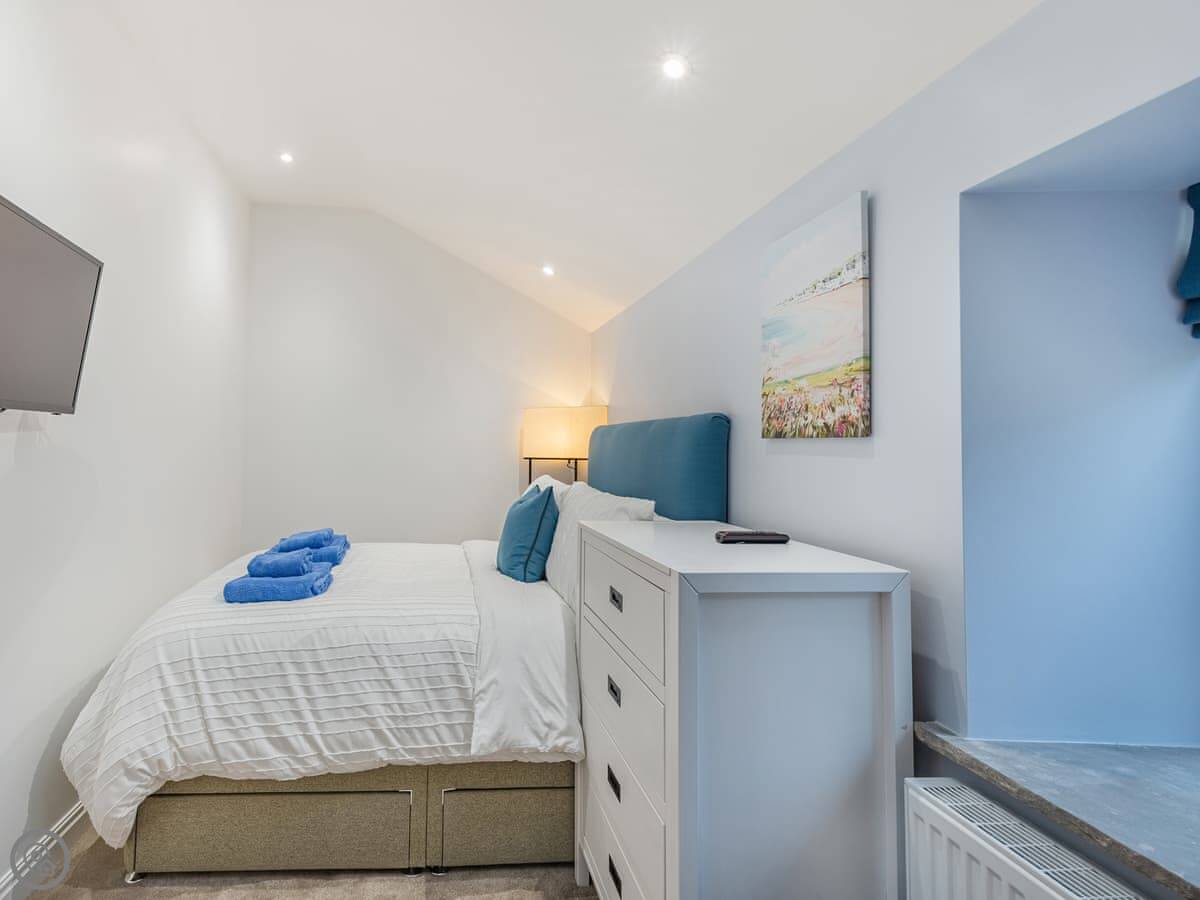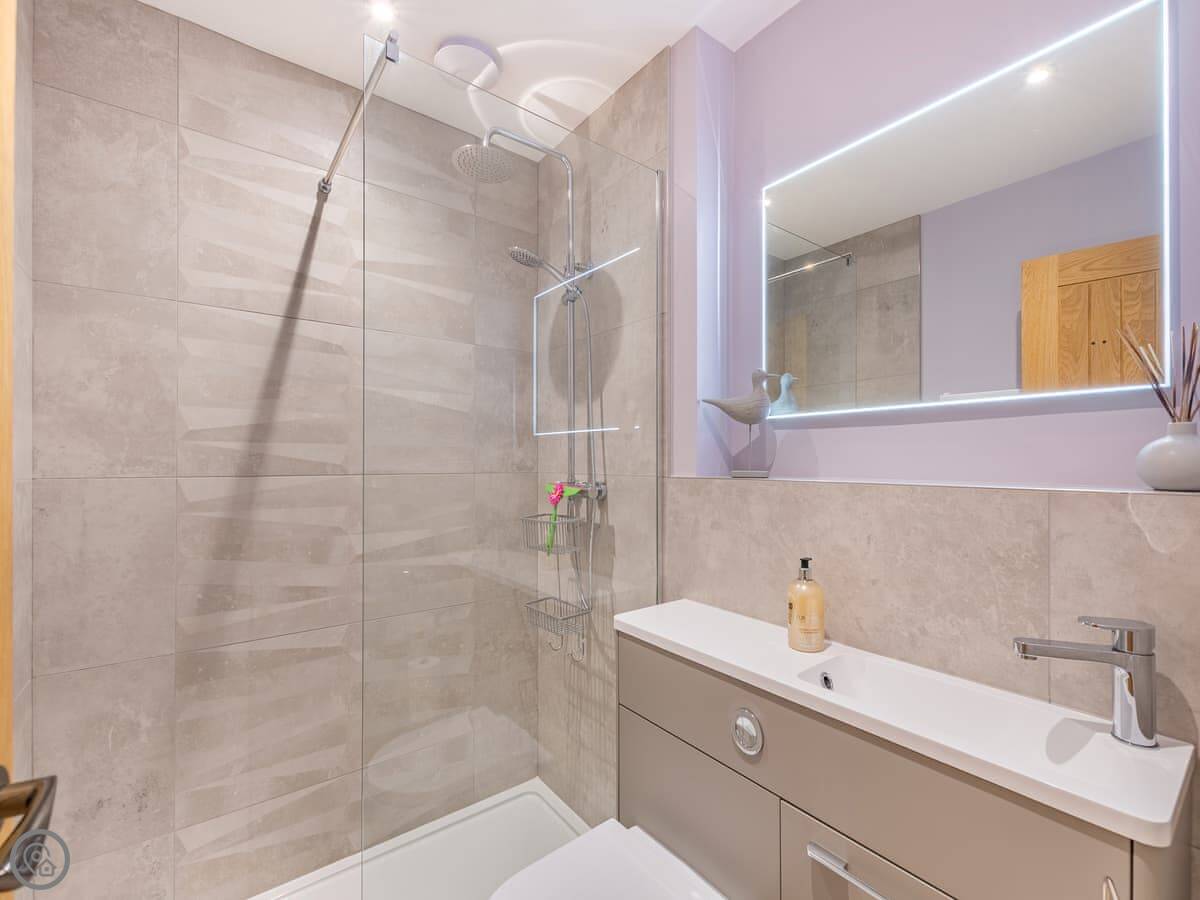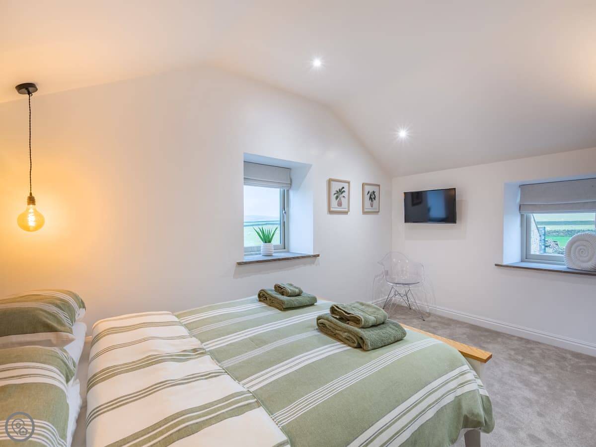 It sleeps six in three bedrooms. Each room has its own shower room, which is useful. One bedroom has a super king bed that can be split into two singles if you prefer.