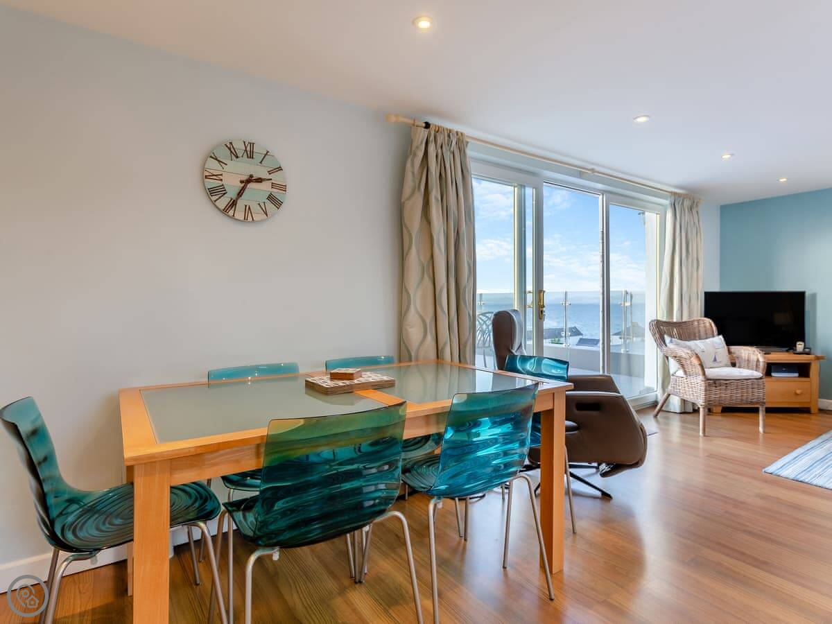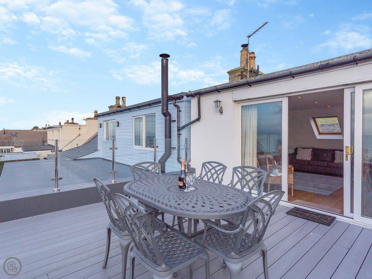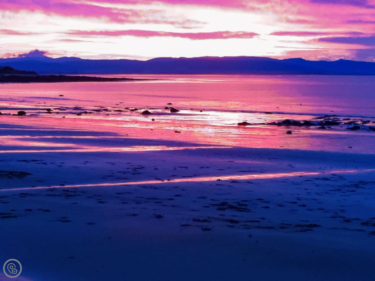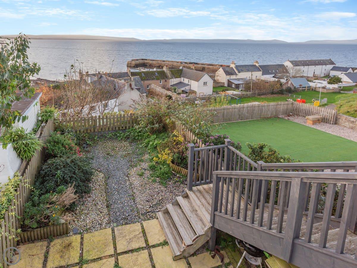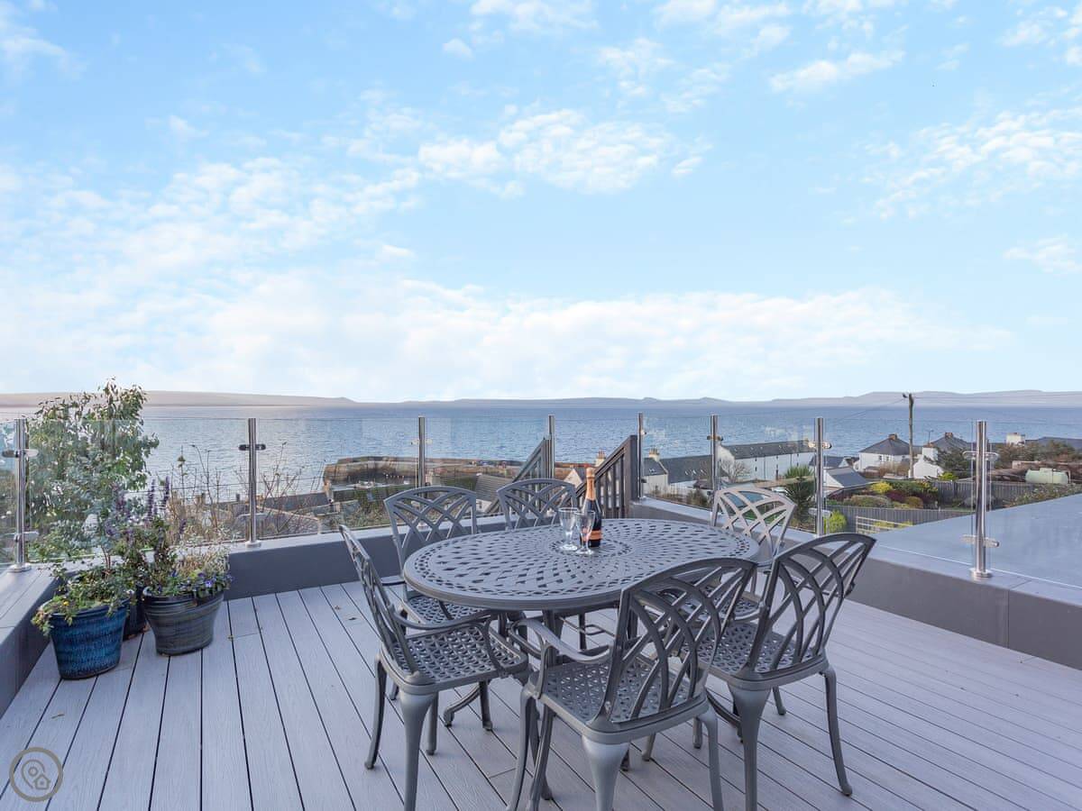 The main thing is the view. The living area upstairs has big windows looking straight out over the Dornoch Firth. There's a deck outside those windows with seating. You get the sunset over the water from there. Sometimes you can see the Northern Lights, but that's luck of the draw.