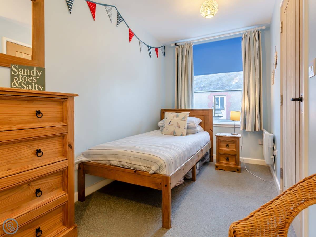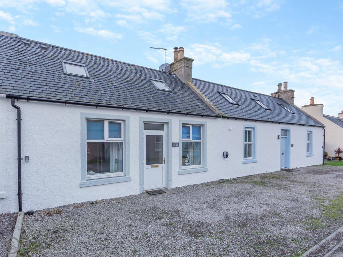 Bayview Cottage is in Portmahomack in the Highlands. It sleeps six. There are three bedrooms and one bathroom, all on the ground floor. The living room and kitchen are upstairs. That's because it's built into a hill, so the back door is on the lower level and the front door is on the upper level. The stairs inside are a standard staircase.
