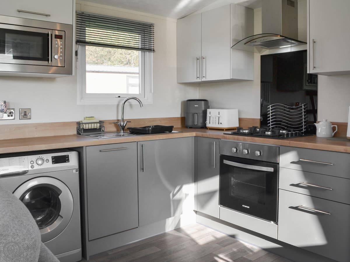The living space is open plan. French doors open onto a deck which is fenced in, so it's secure for a dog. You can bring one dog with you. The kitchen has a dishwasher and there's a washing machine in a cupboard.