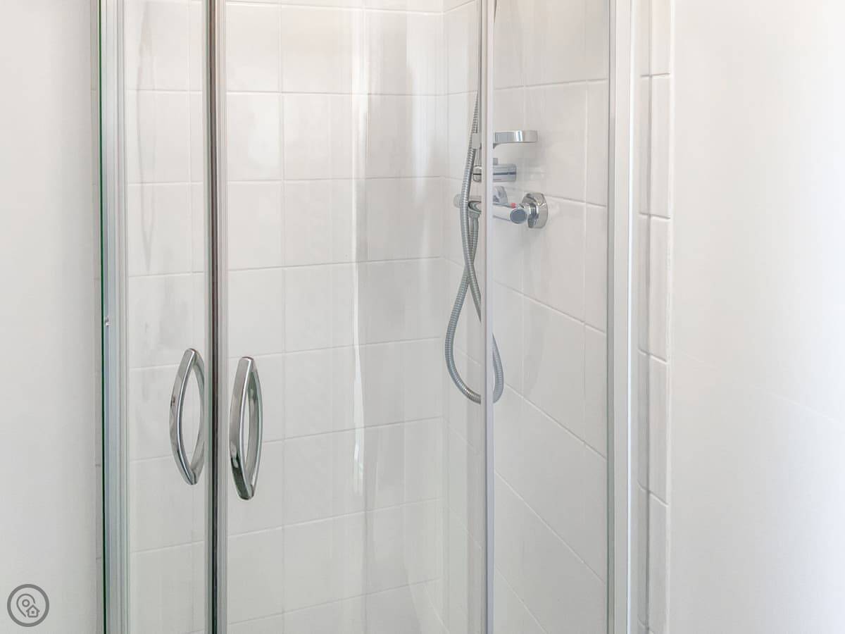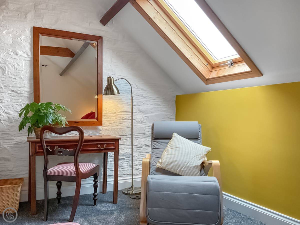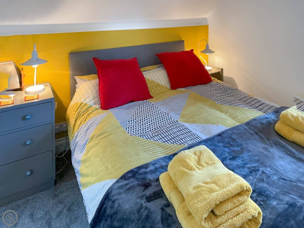 It's a one-bedroom place for two people. There's a wood burner in the main room. The stairs go up to the bedroom, which has a kingsize bed. The bathroom has a shower. It's got a 4 Star rating, so it's comfortable and well kept.