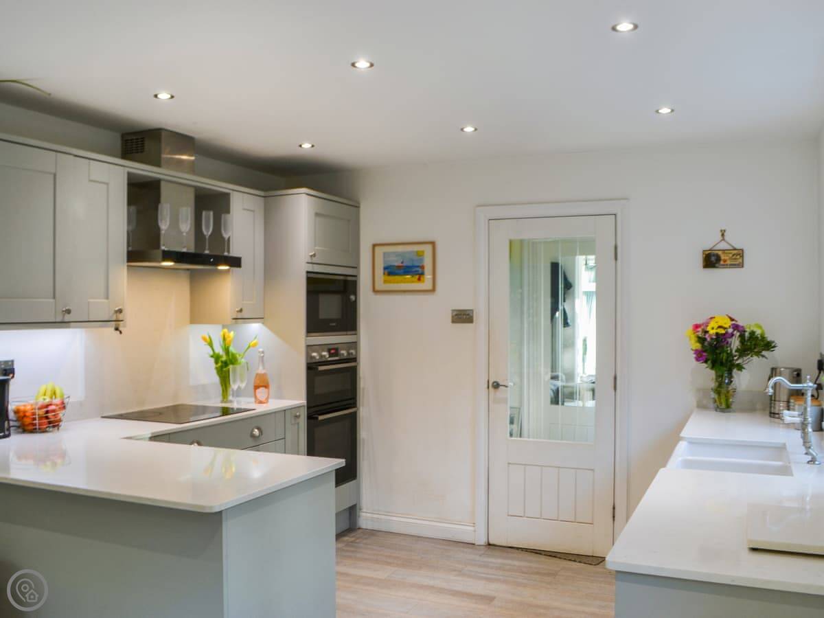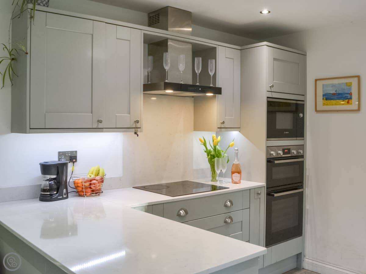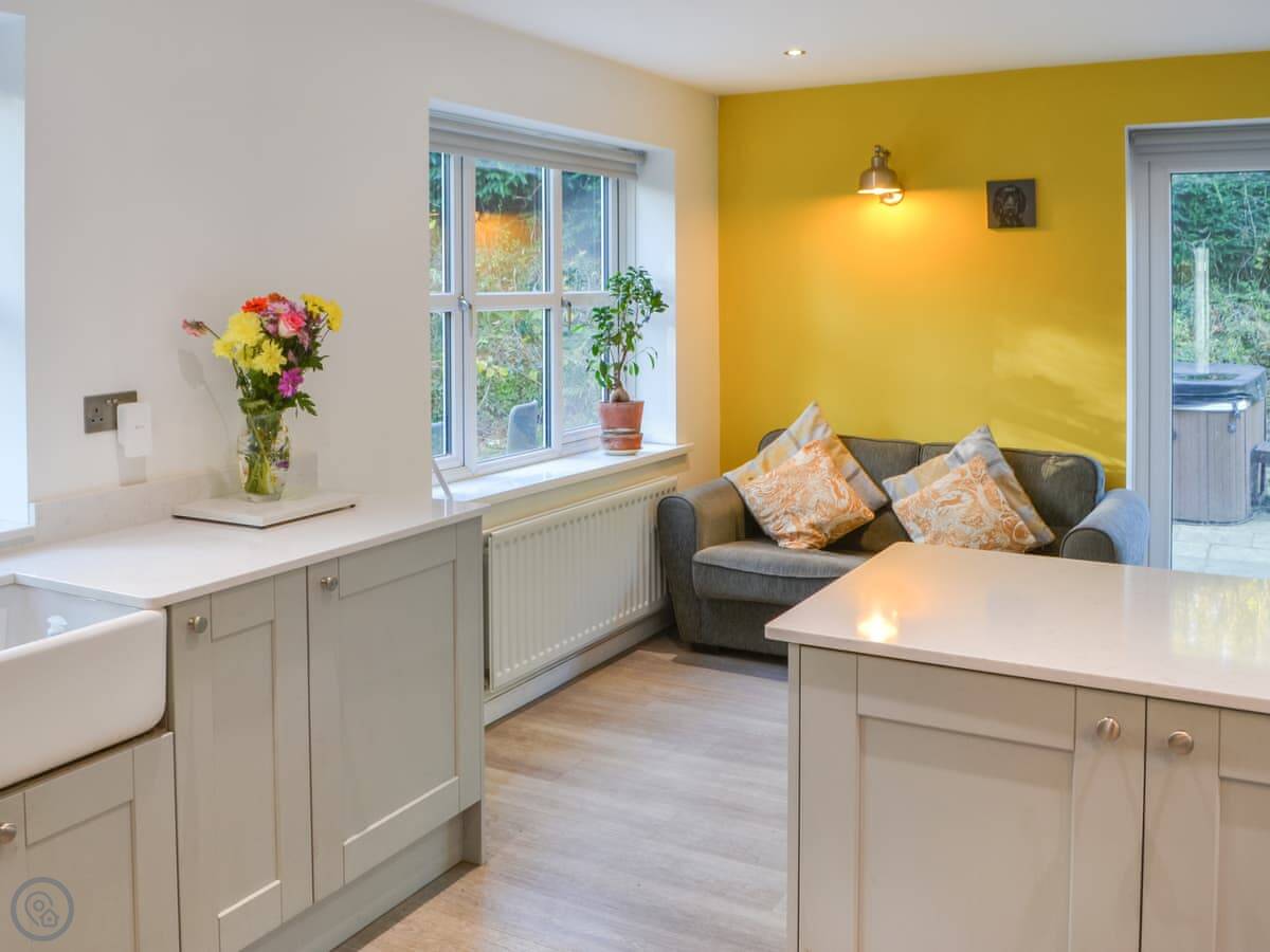 Inside, there's a main living room with a wood burner, and a smaller second sitting area with a TV. The kitchen is open plan with the dining space. It's modern.