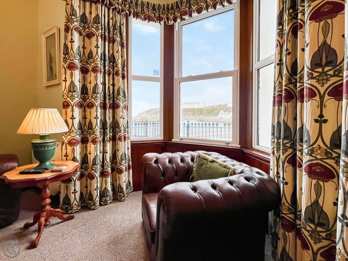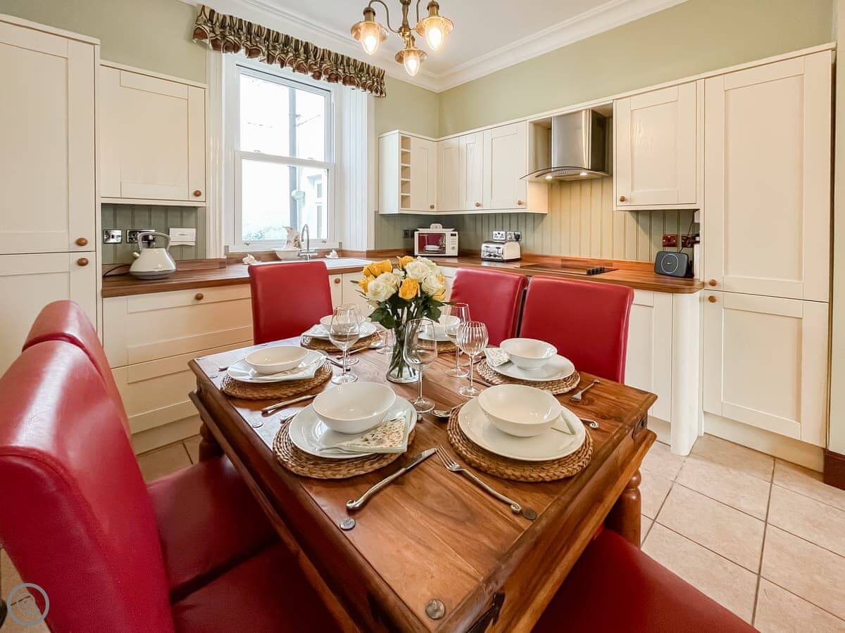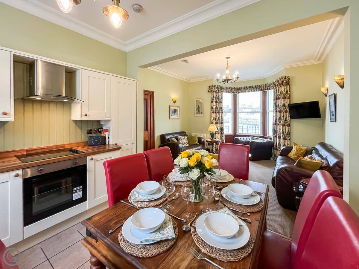 The main room is open plan at the front, with a big bay window. You get the view from there and the kitchen table. There's a TV, WiFi, a washing machine, and a dishwasher. Bedding and towels are included.