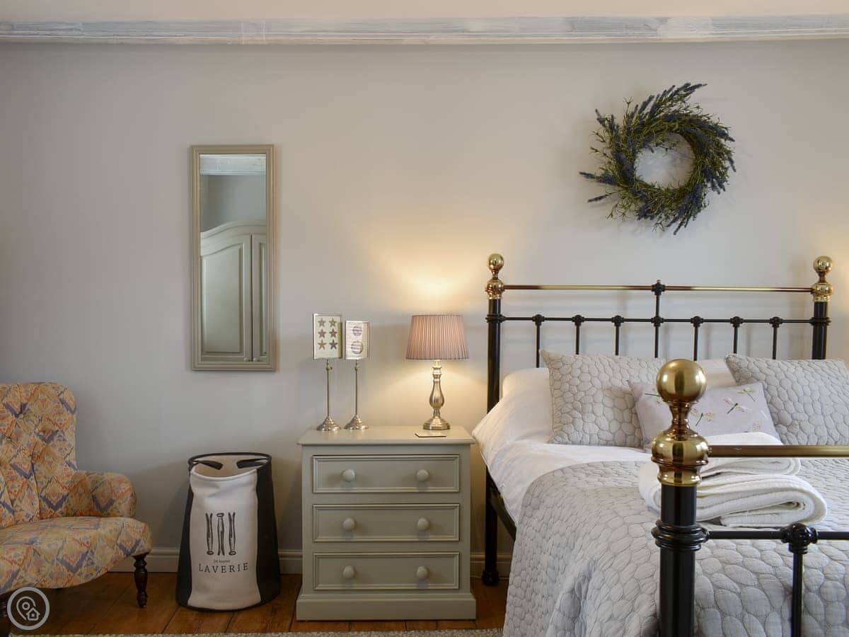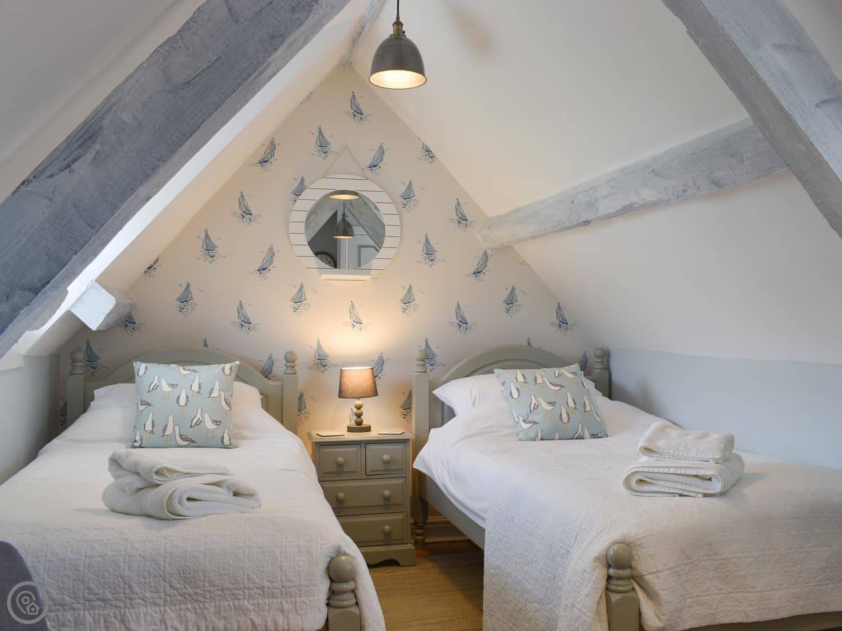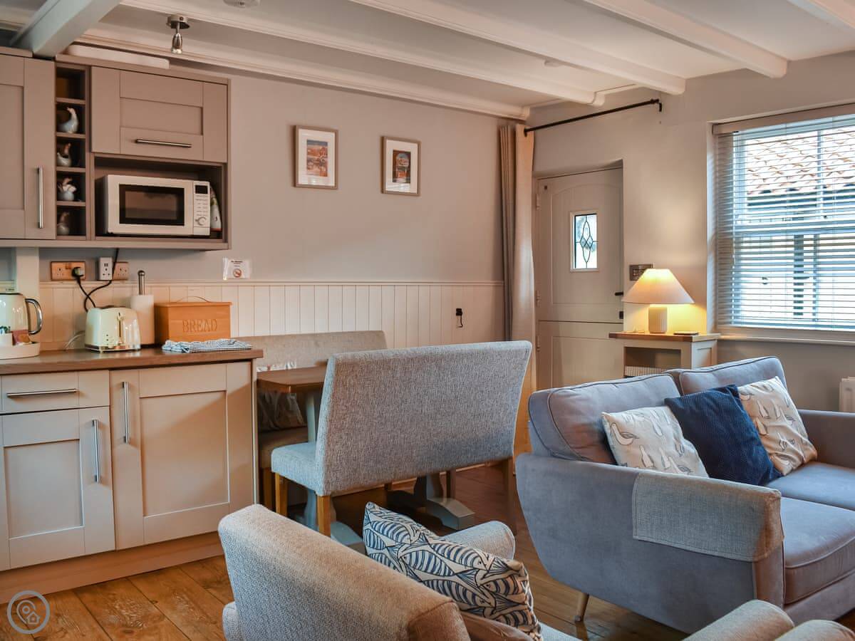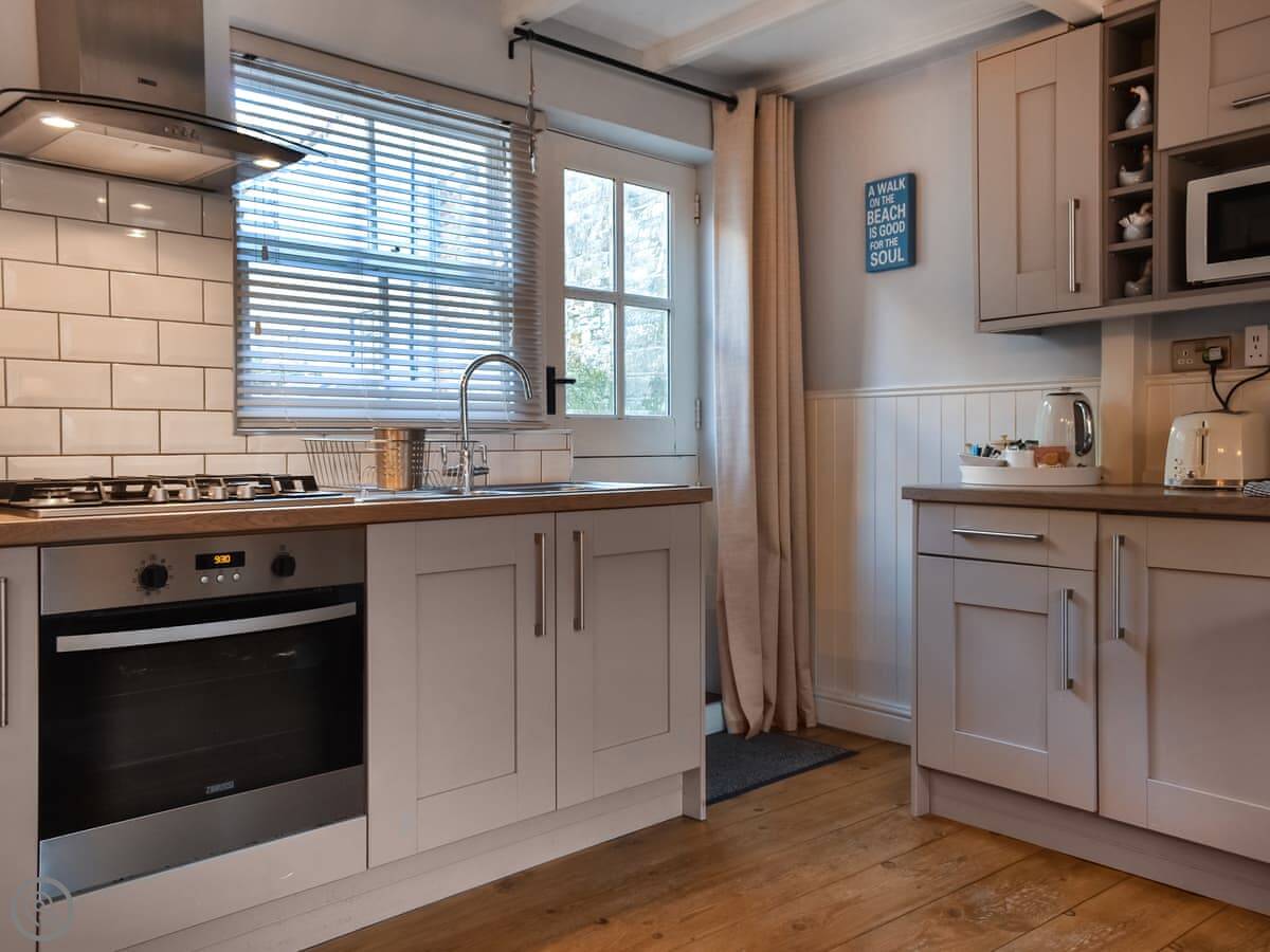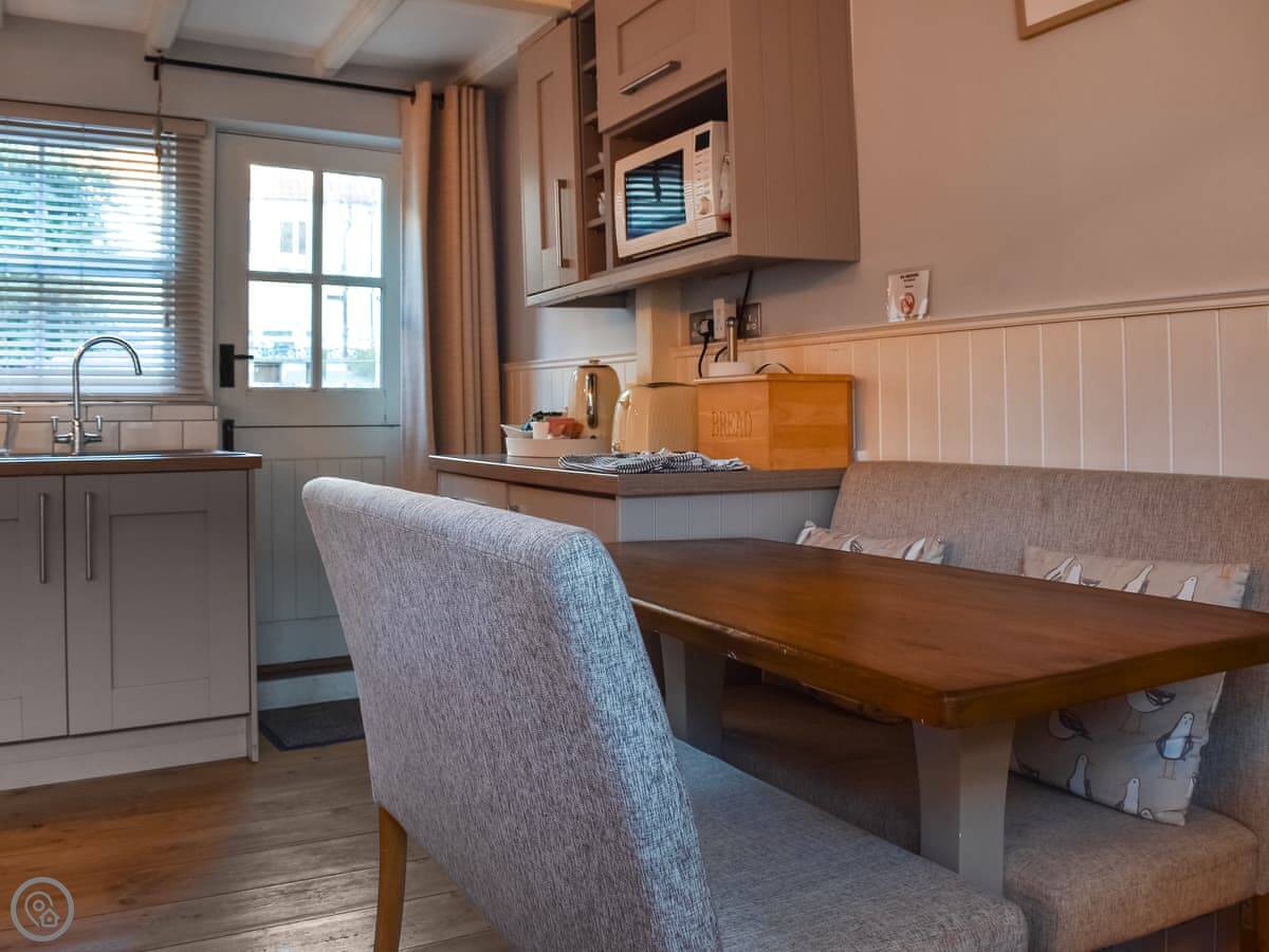 It's small but it sleeps four. Two bedrooms, one bathroom. It's got a 4 Star rating, so it's comfortable and has everything you need. The kitchen and living area are all one room downstairs. There's WiFi and a TV. Bedding and towels are included, and there's a washing machine.