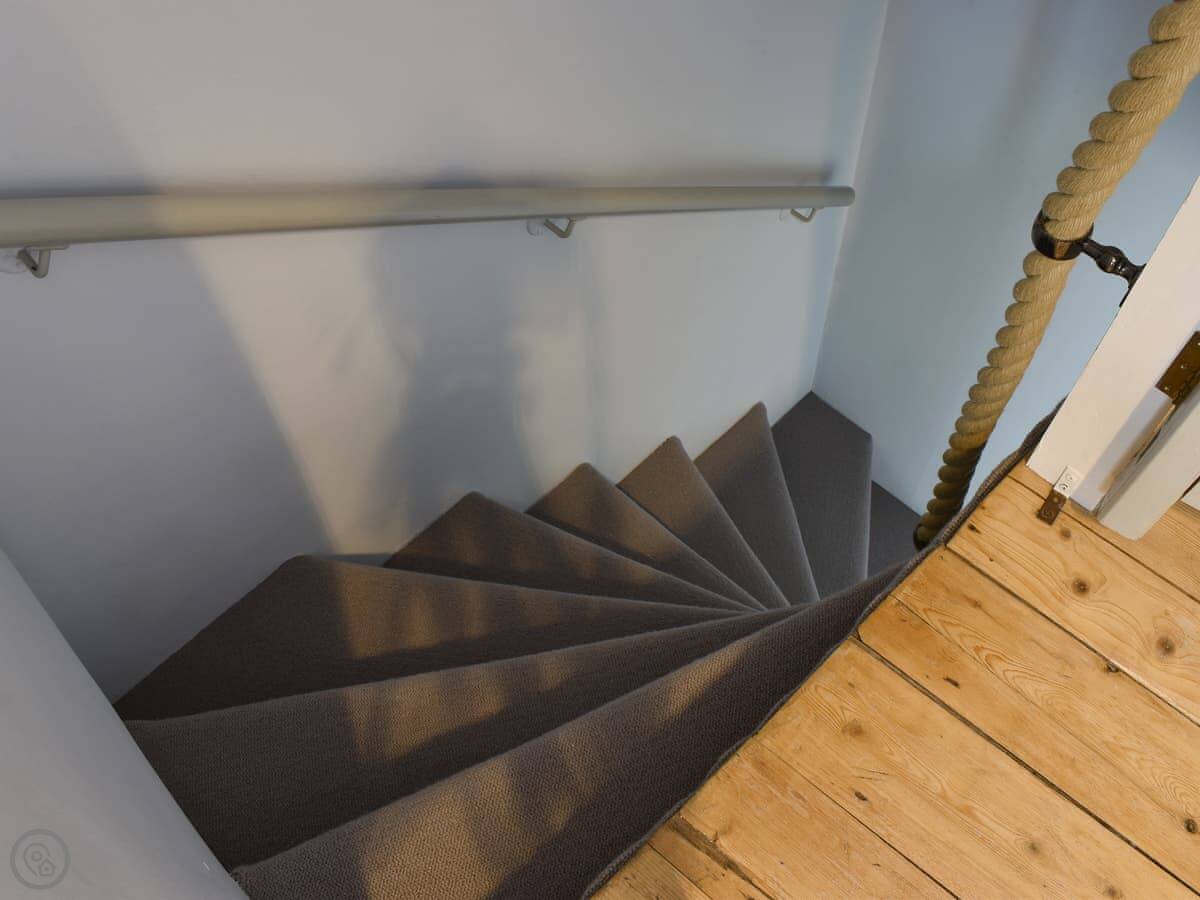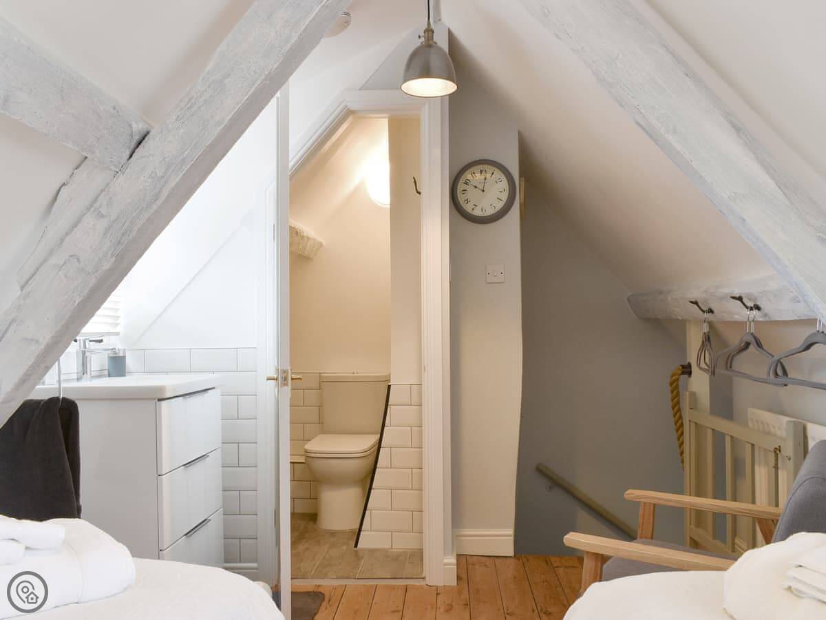 Because it's so old, there are a few things to know. There are some stone steps up through the shared yard to get to the front door. They're not terrible, but you notice them with bags. The stairs inside are winding and a bit steep. The second bedroom is up in the attic, it's a twin room with its own toilet and sink.