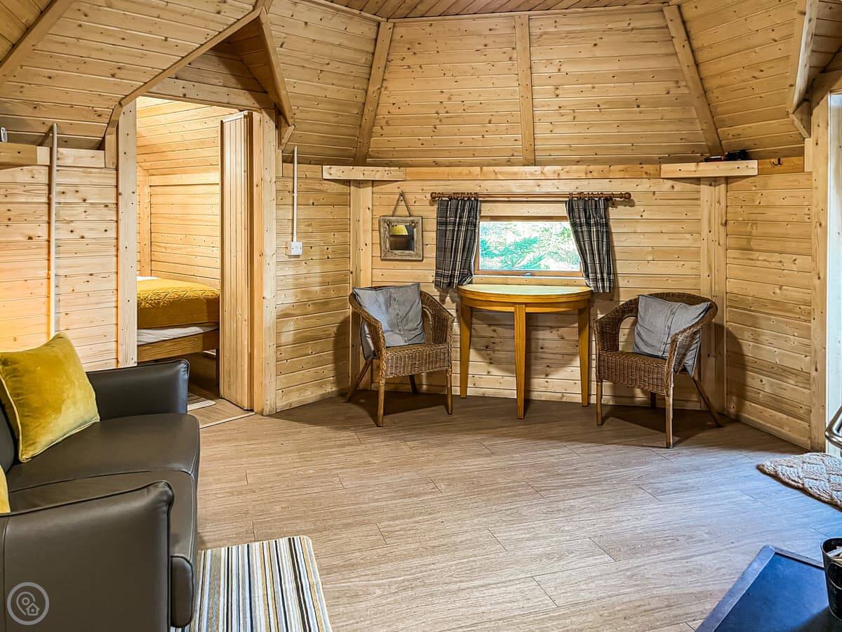 It's off-grid, so it runs on solar power and collects rainwater. There's a wood-burning stove for heat and a gas hob for cooking. The lights and sockets work off the solar. You'll need to be a bit mindful with power, but it's fine if you're used to it. Bedding and towels are included.
