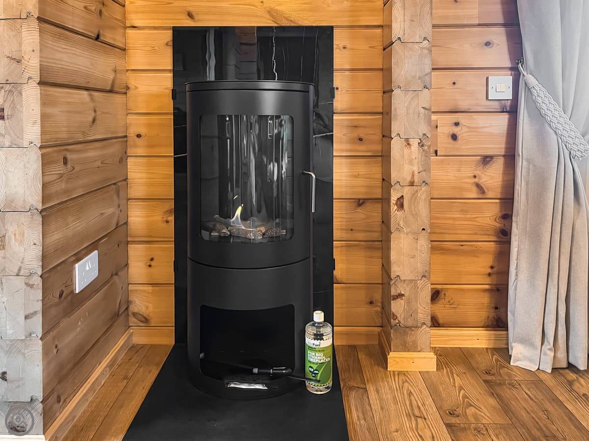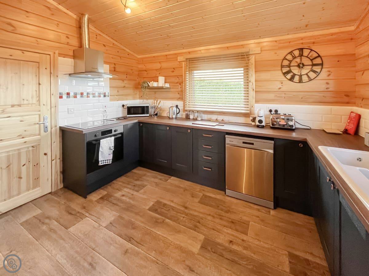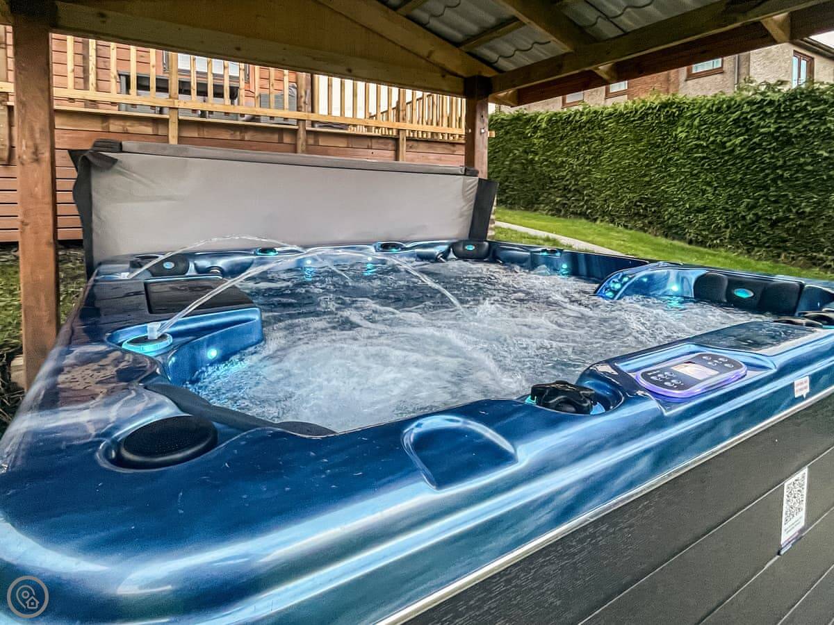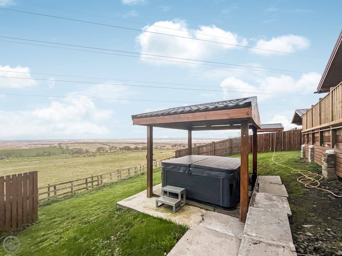 The main living space is open plan. Doors open straight out onto a private deck. The hot tub is under a cover at the front of the lodge. The garden is enclosed. There's a family of sheep in the field in front.