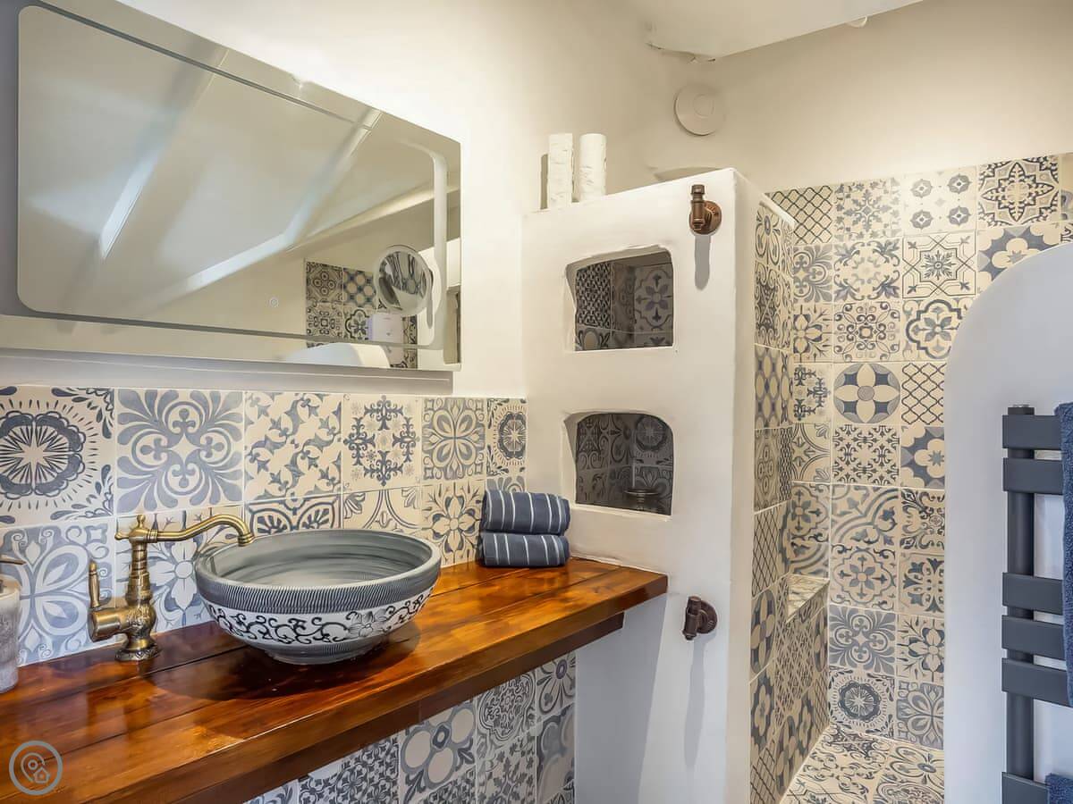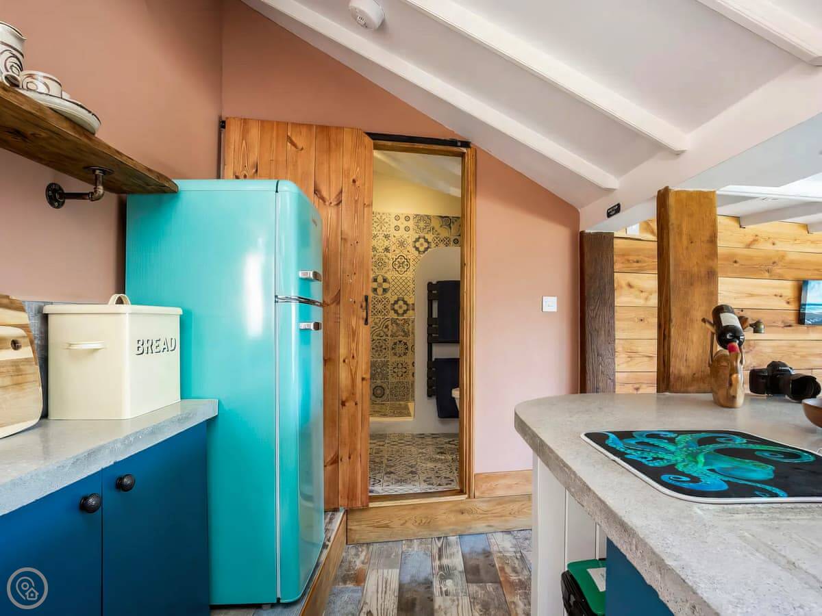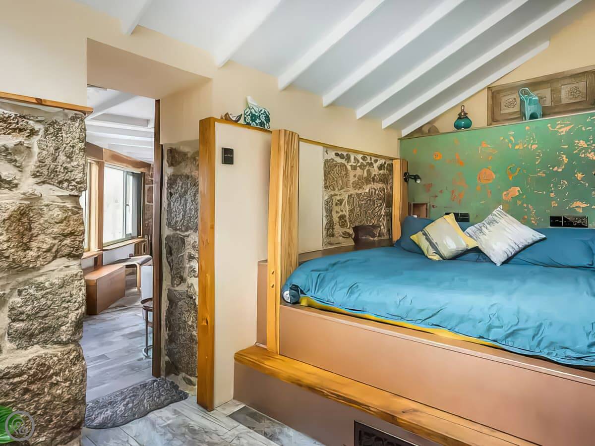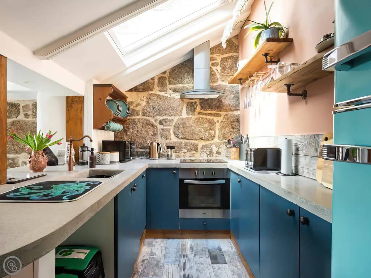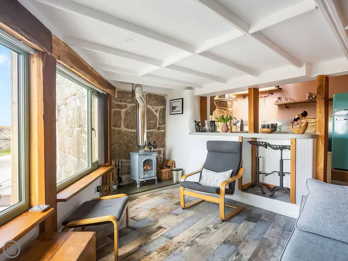 It's a single open-plan room downstairs, with the kitchen, sitting area and a wood burner. Upstairs is the bedroom and bathroom. The stairs are the original ones, so they're quite steep and narrow. That's just how it is. You'll see the old stone walls inside. There's no TV, but the wifi is good if you want to stream something on a laptop.