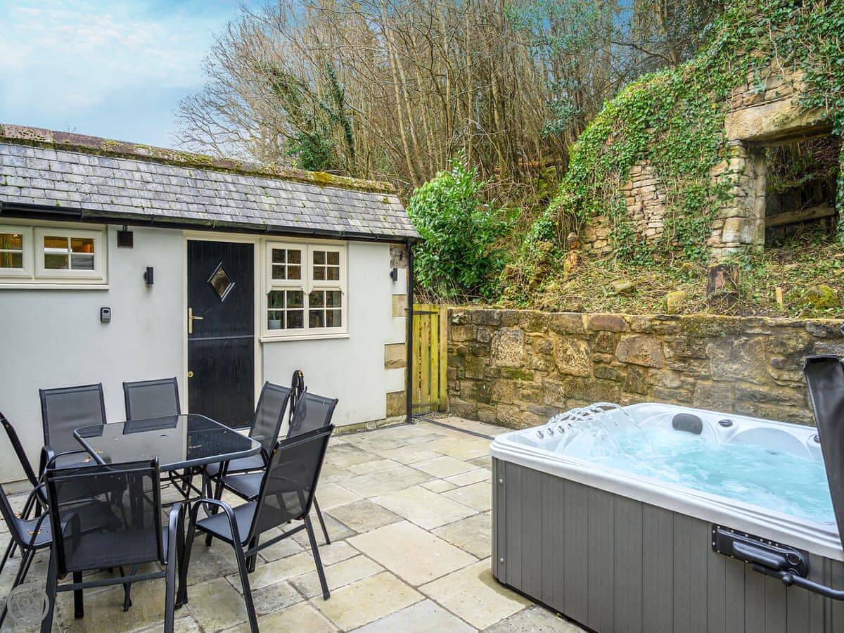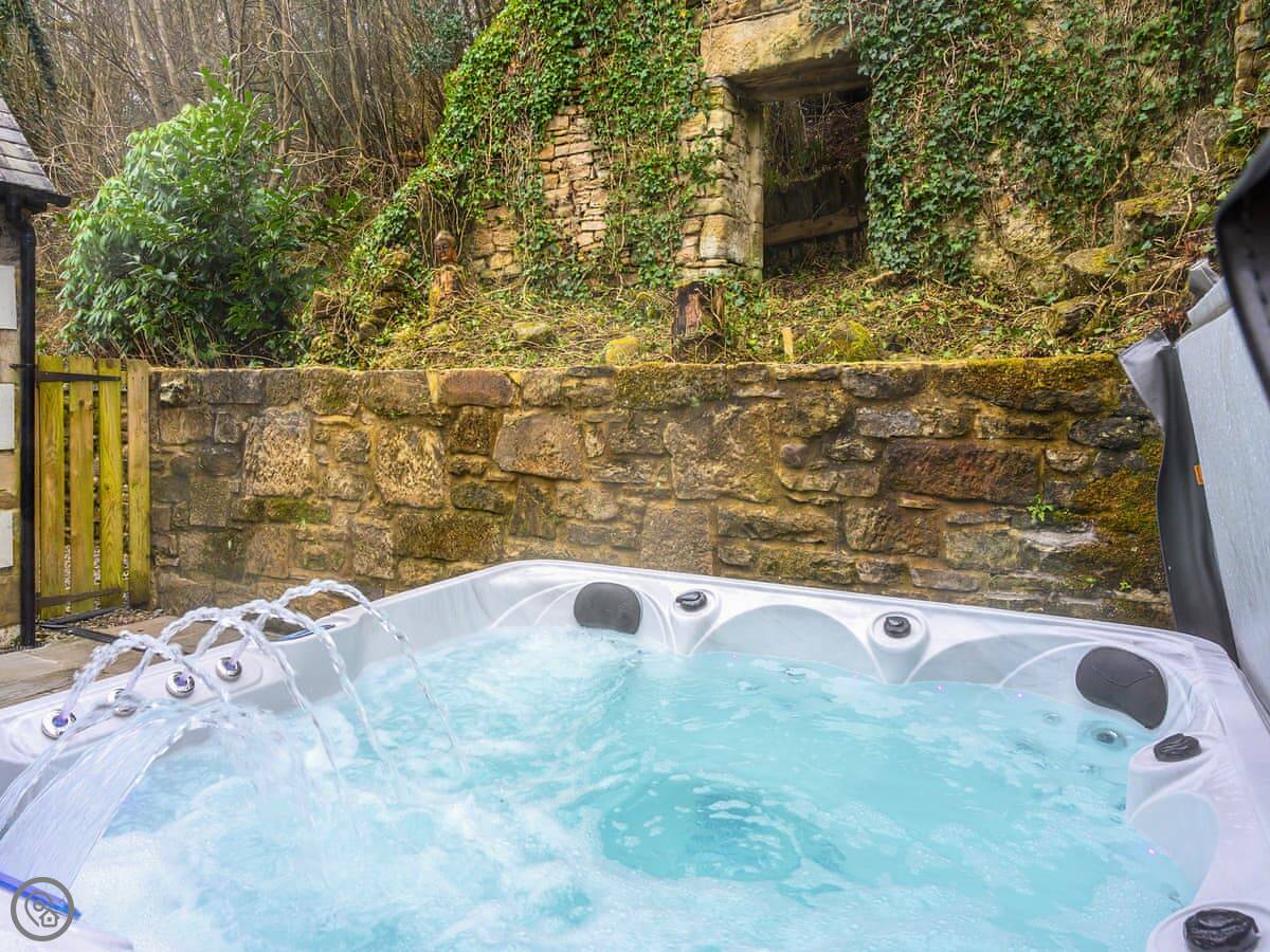 The kitchen is big and has a dishwasher and washing machine. There's a separate dining room and a lounge with a TV. The stairs are fine. Outside there's a hot tub and parking for a few cars.