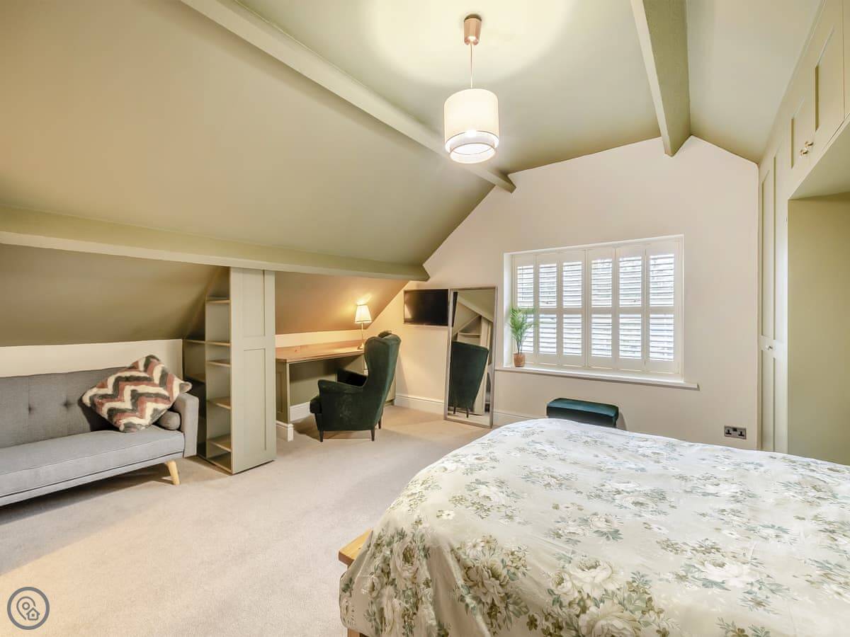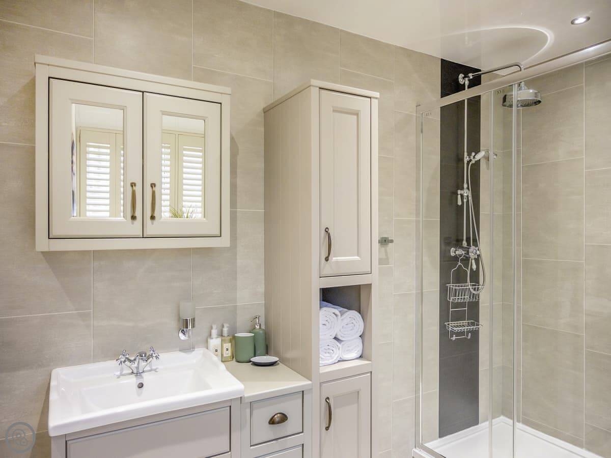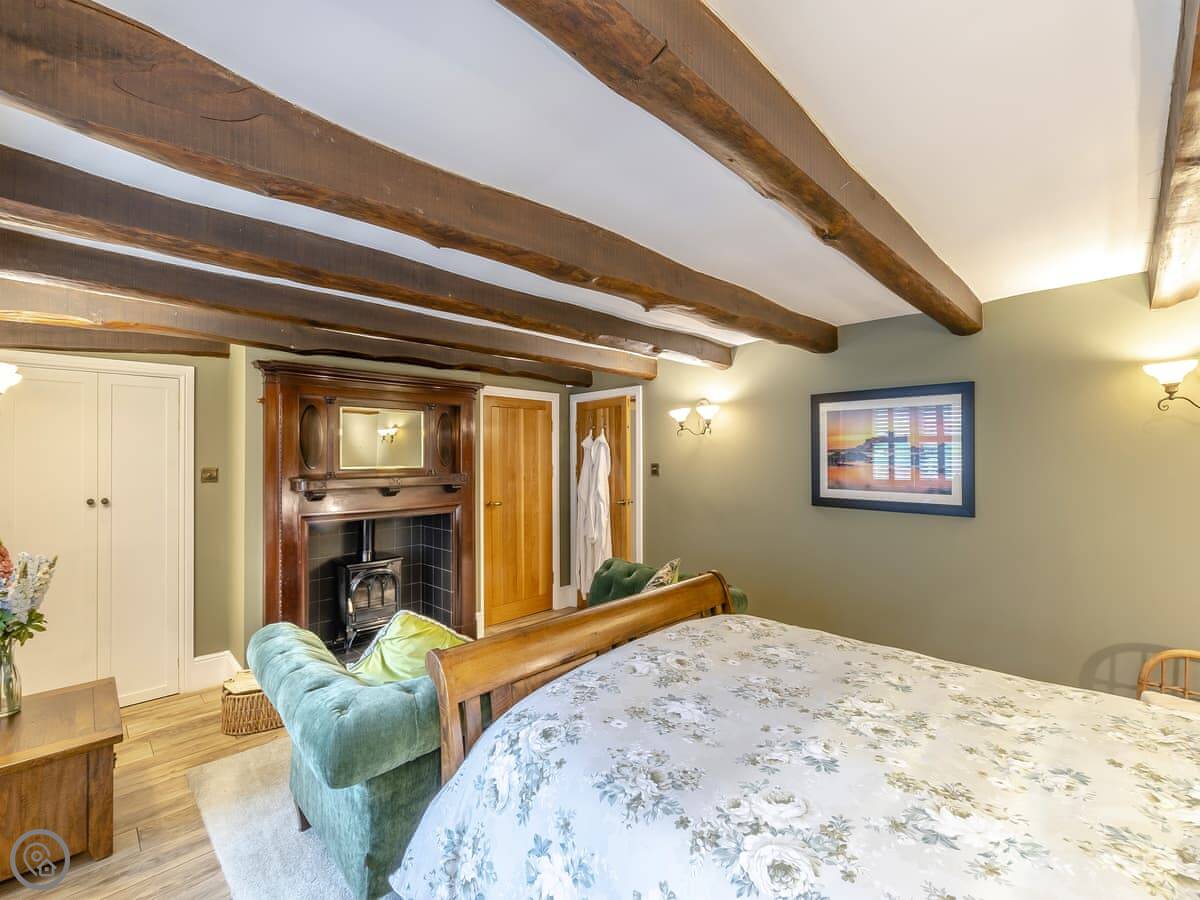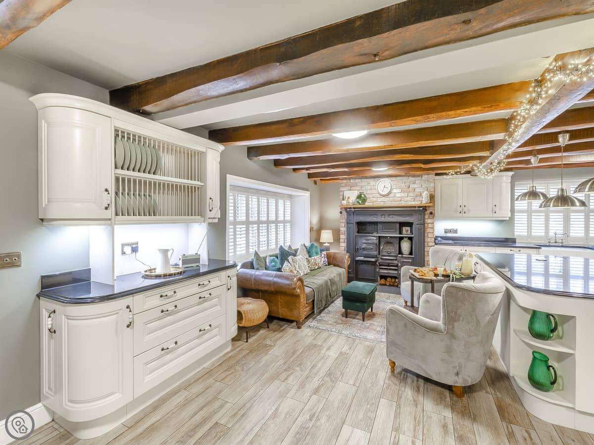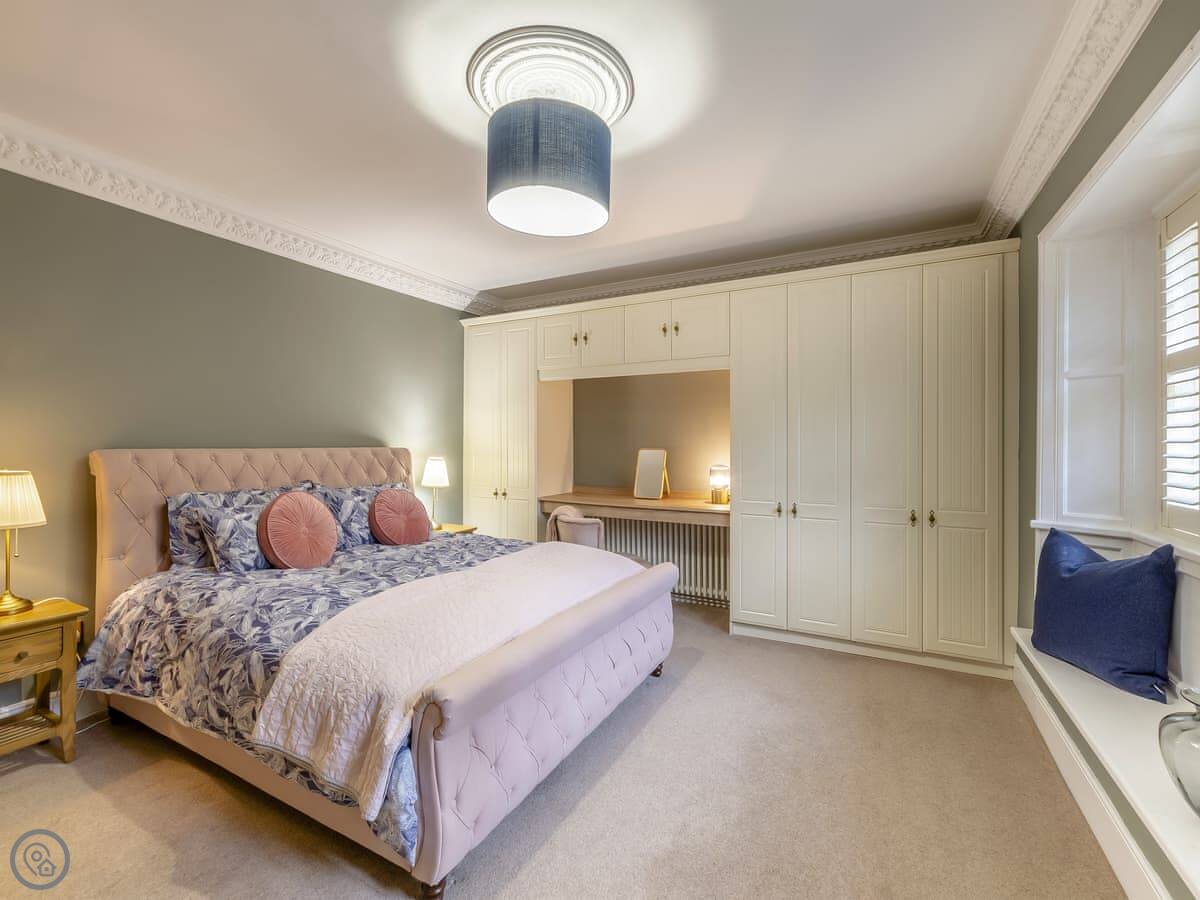 It sleeps eight. Four bedrooms, three bathrooms. Two of the bedrooms are super king size, the other two are king size. One of the king rooms is downstairs. It's got a 5 Star rating, so it's well-equipped and finished to a high standard. Everything's included, like bedding and towels.