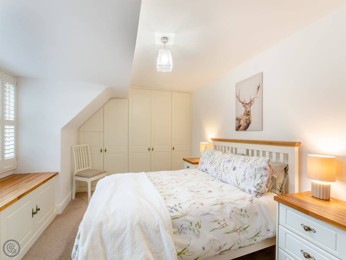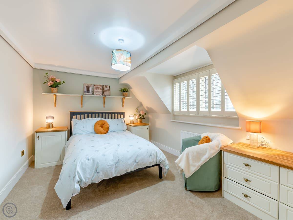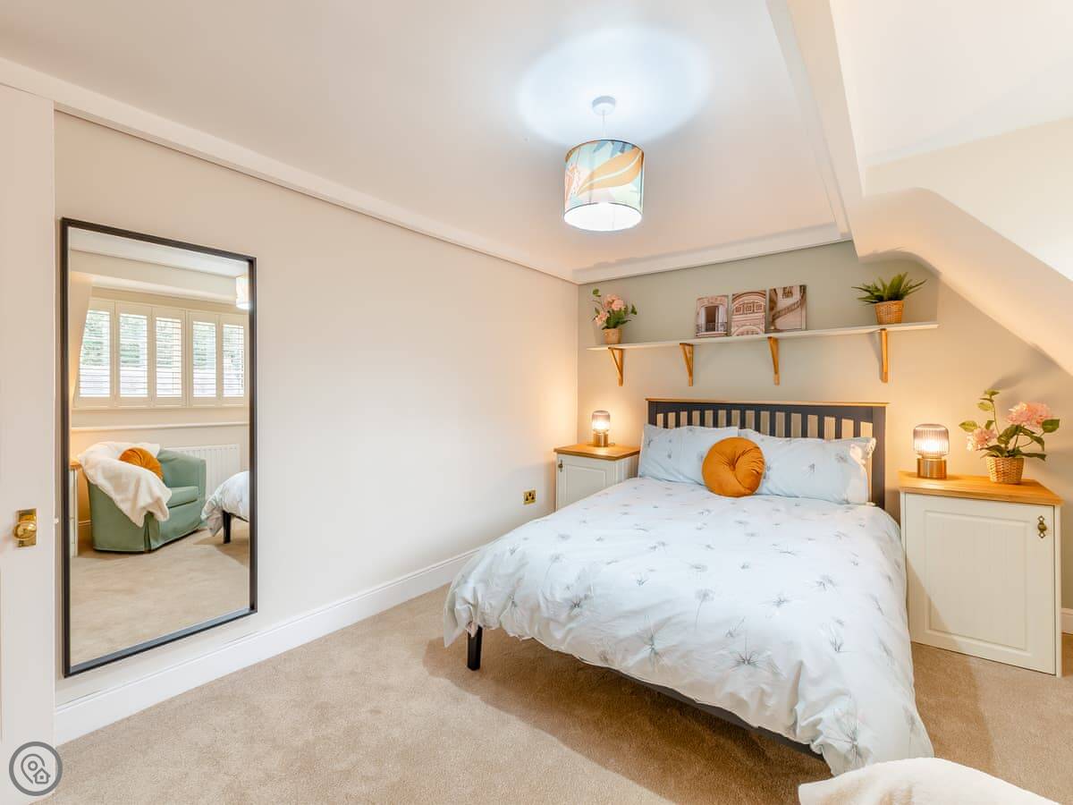It sleeps six people in two bedrooms. Both rooms have king sized beds. There's a sofa bed in one of the sitting rooms as well. One family bathroom with a bath and a separate shower. There's also a downstairs toilet.