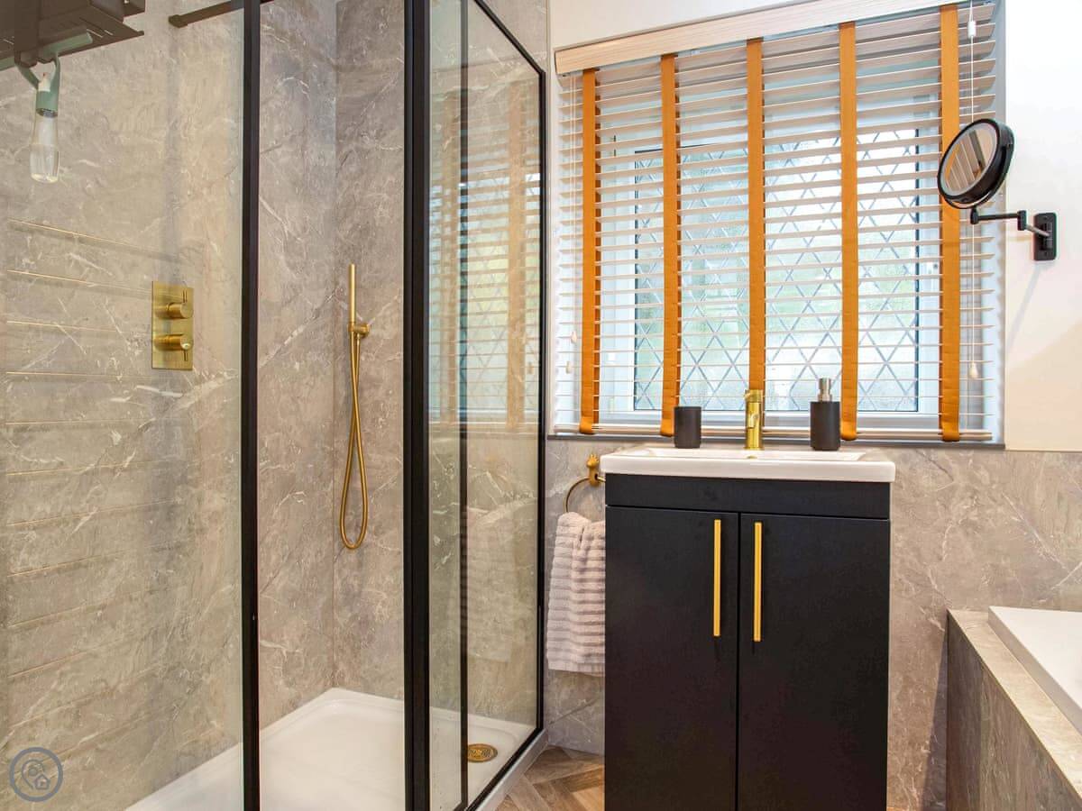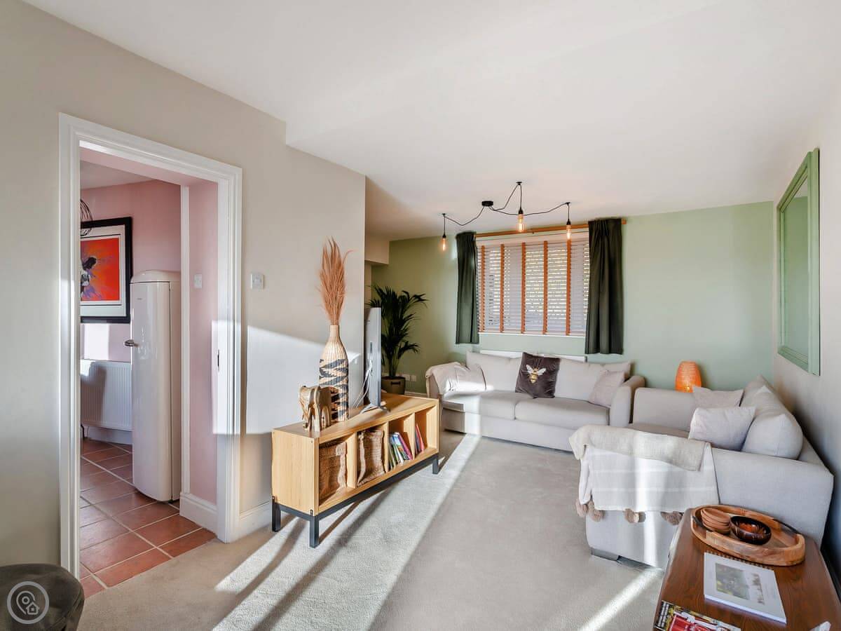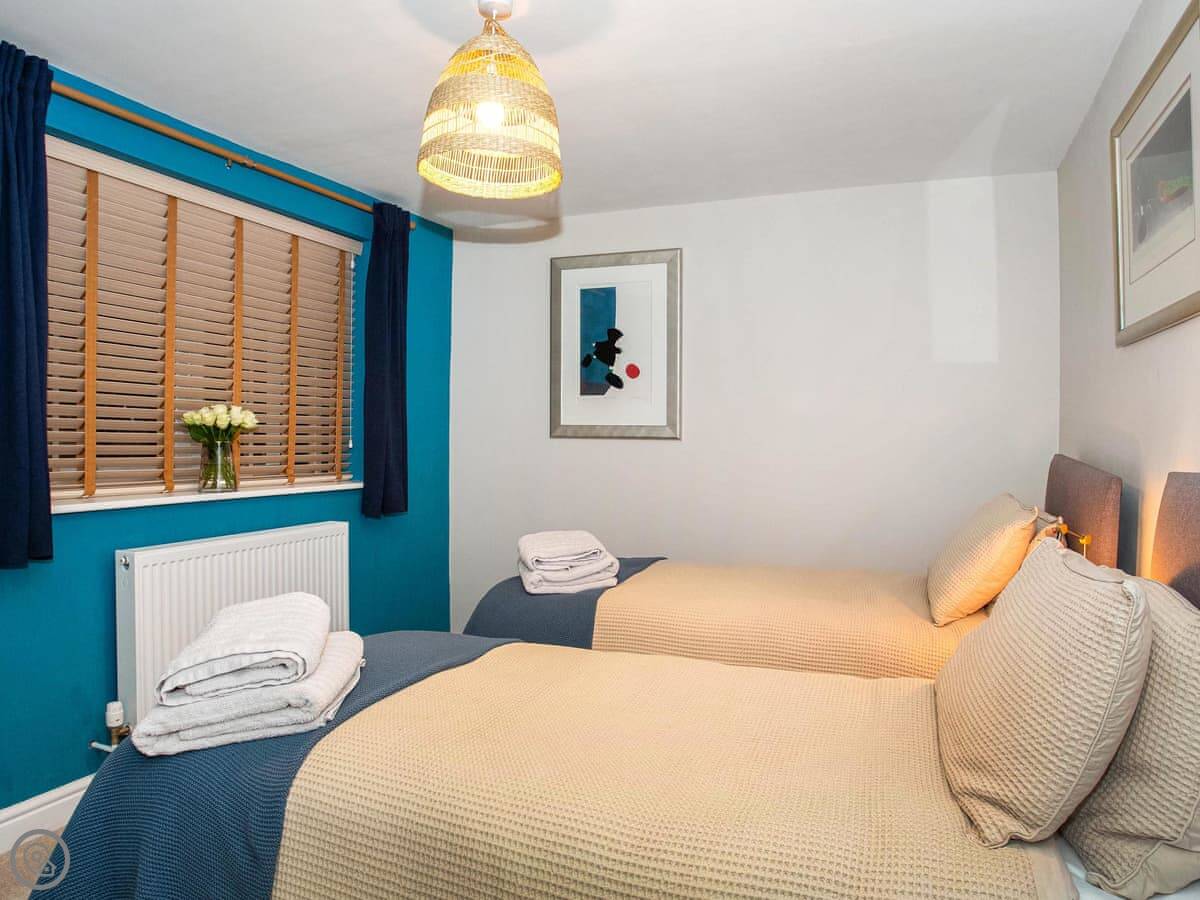 It sleeps four. Two bedrooms, one bathroom. It's got a 4 Star rating. One bedroom has a super king bed and a bay window seat. The other has two singles. The bathroom has both a bath and a separate shower cubicle.