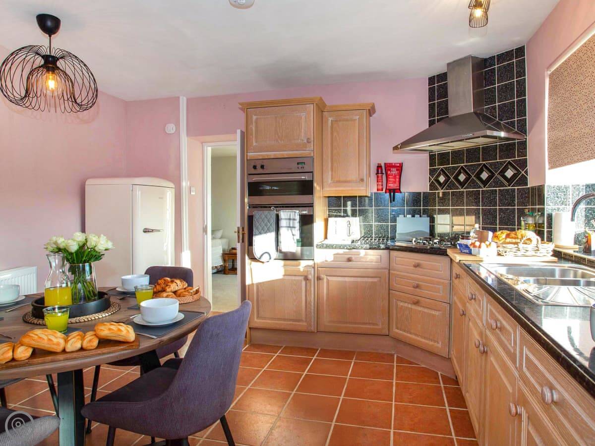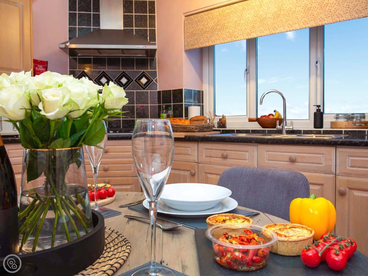 Inside, it's all on one level, which is handy. There's a living area with patio doors to the garden. The kitchen has a dishwasher and a washing machine. Bedding and towels are included. There's a cot and highchair if you need them. One well-behaved dog is allowed.