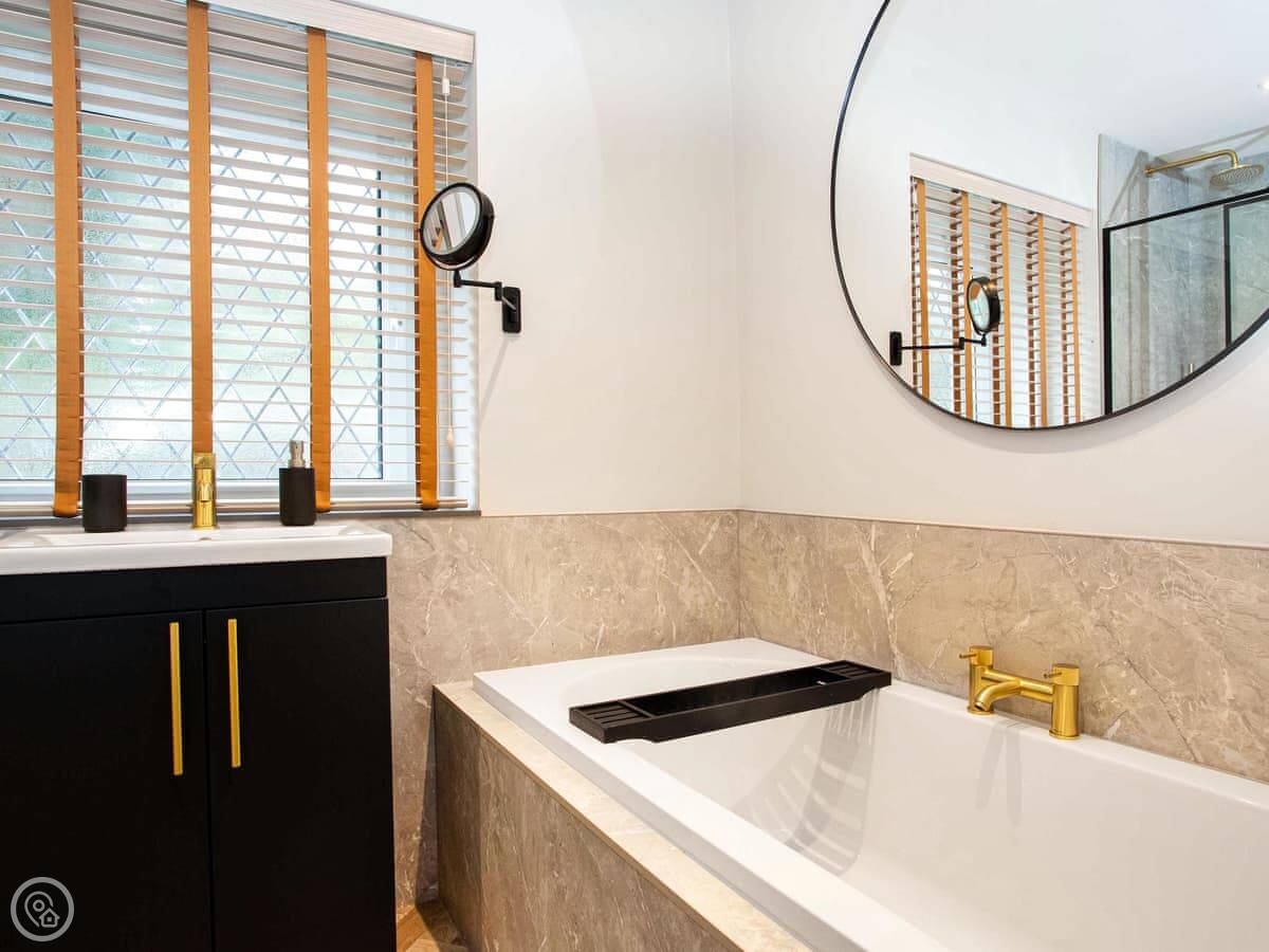 The garden is tiered, so it's on a bit of a slope. It's enclosed. It has a wood-fired hot tub. You need to get the fire going yourself, it's not a push-button one. It takes a couple of hours to heat up.