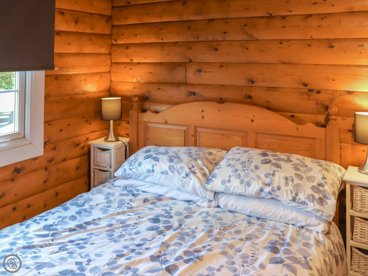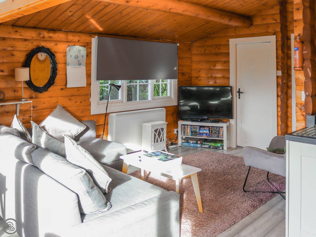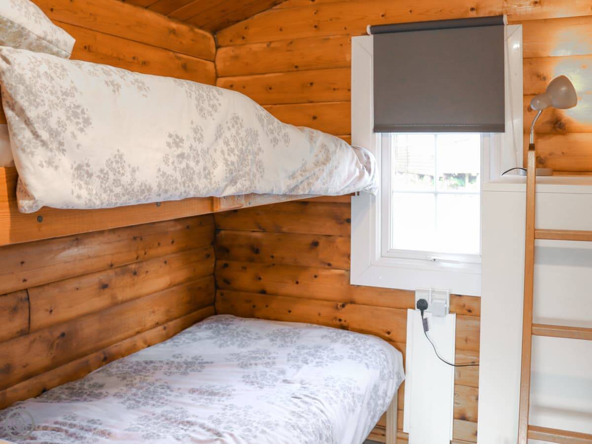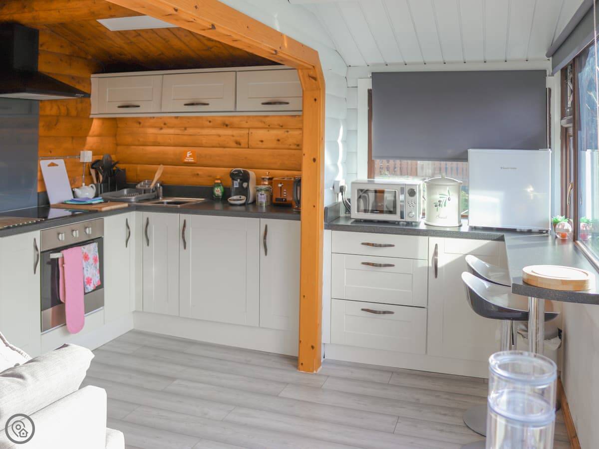 It sleeps four, with two bedrooms. One's a double, the other has full-sized bunk beds. There's one shower room. It's got a 4 Star rating. It's clean and comfortable, but it's a cabin in Wales, so expect a few scuffs here and there. The living space is all open plan.