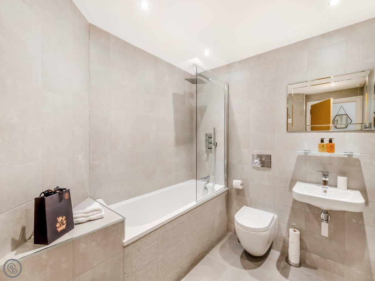 The whole place is on one floor, flat access from the lift. It's open plan: living area, kitchen, dining table all together. The kitchen has a dishwasher and a washing machine. Bed is a king size. Towels and bedding are included.