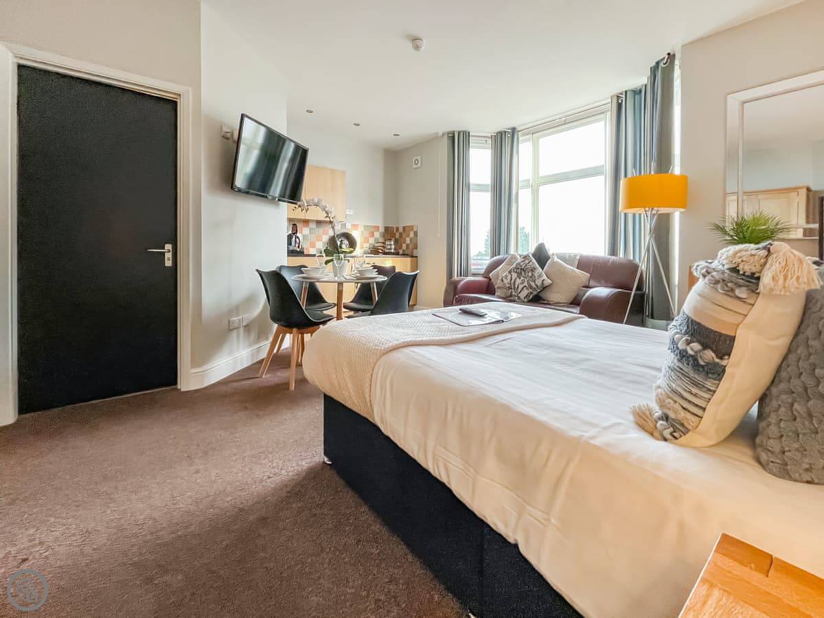 The main thing is the view. You look straight out at the pier and the sea. The living room and bedroom are all in one open space, with a kitchenette at one end. There's a separate shower room.
