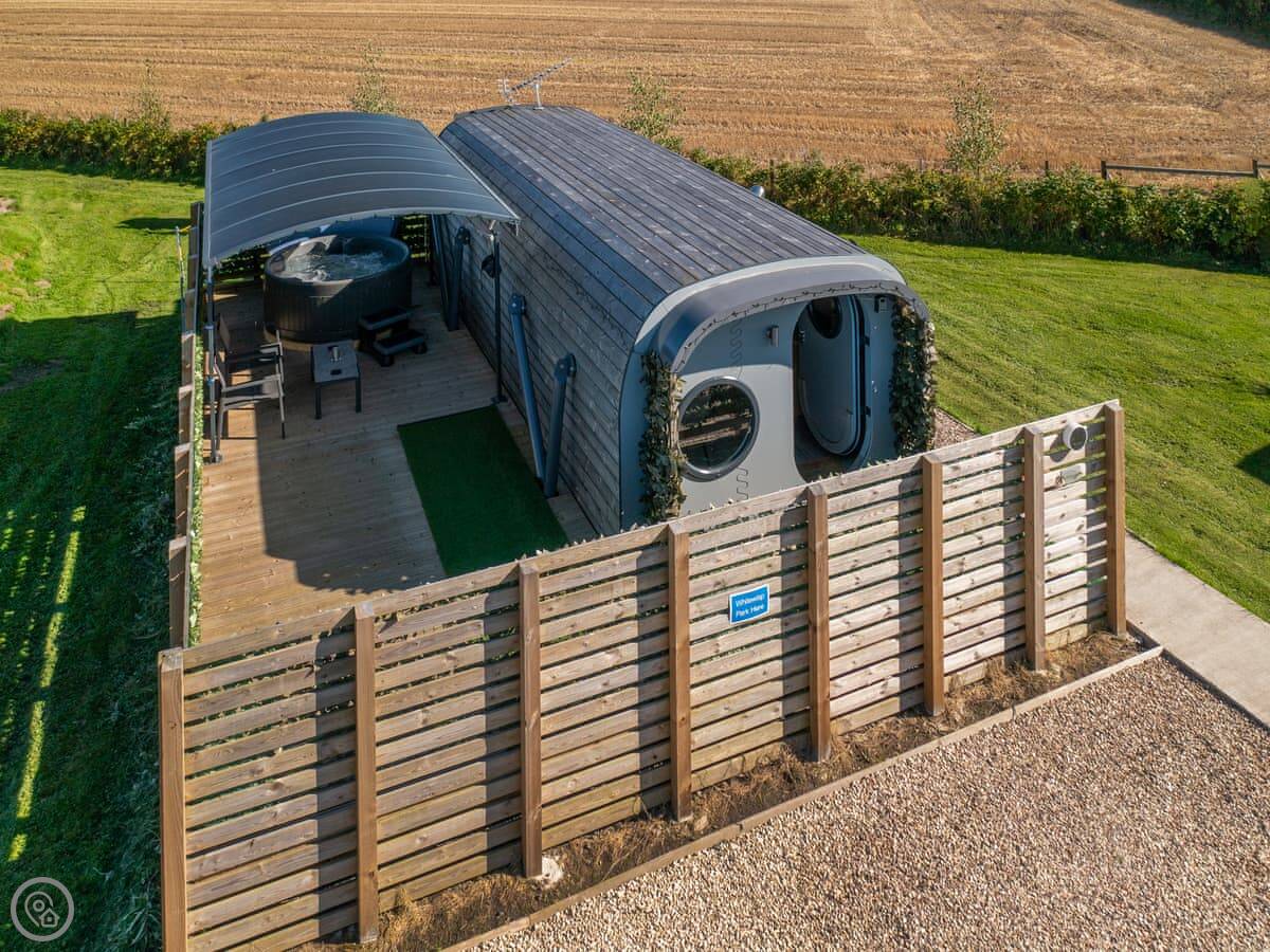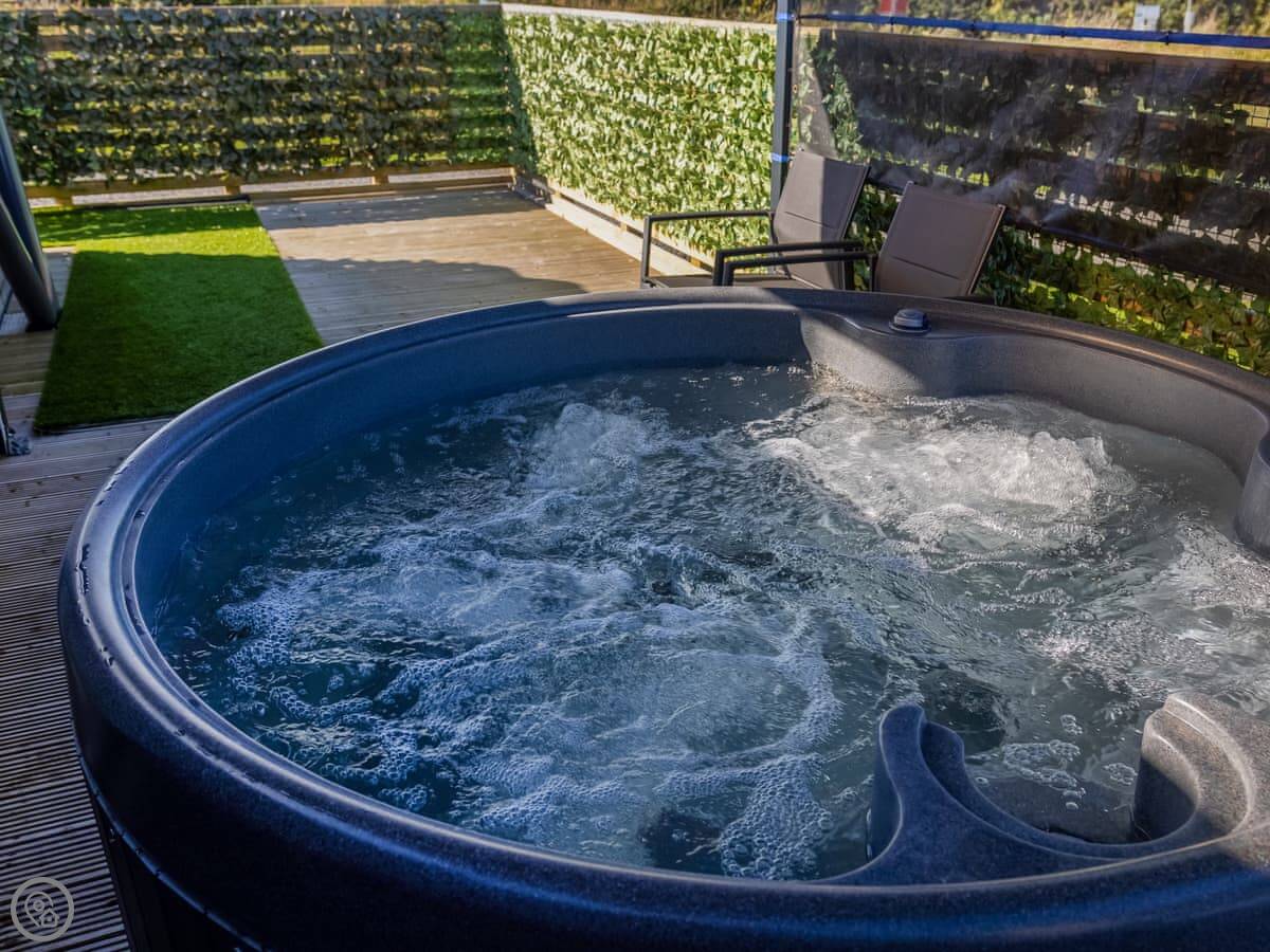 It's for two people. One bedroom, one shower room. It's got a 4 Star rating. It's clean and modern inside. The main thing is the hot tub on the decking outside.