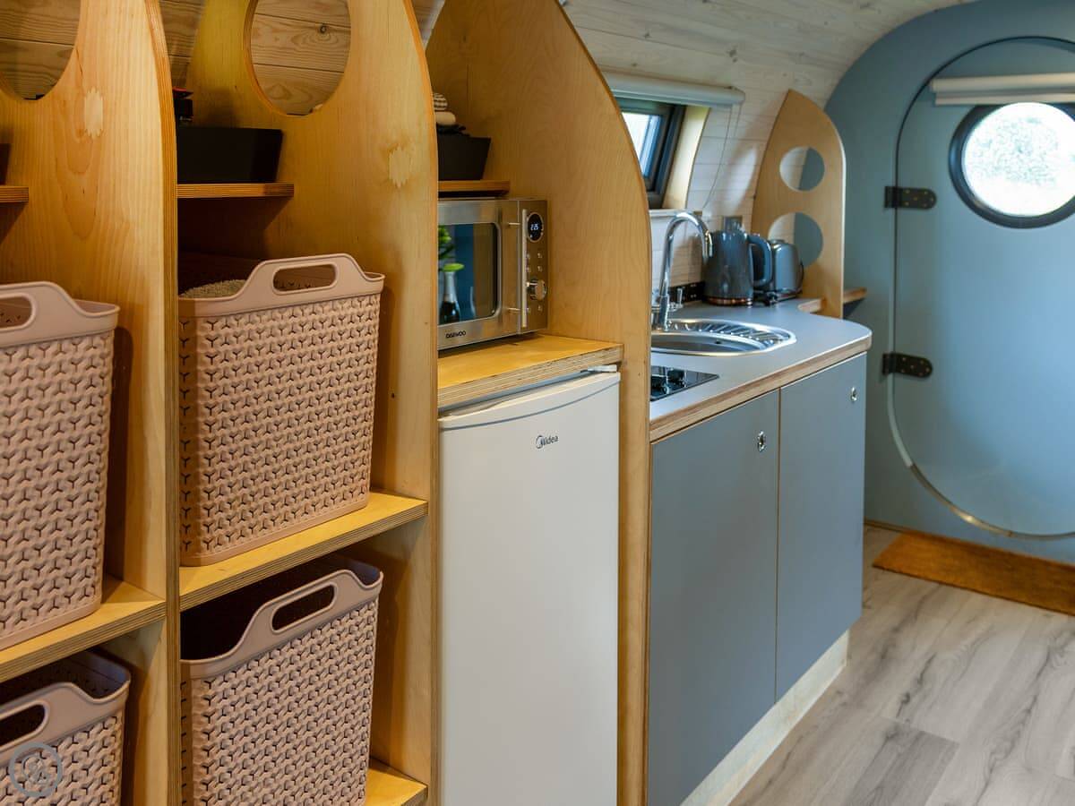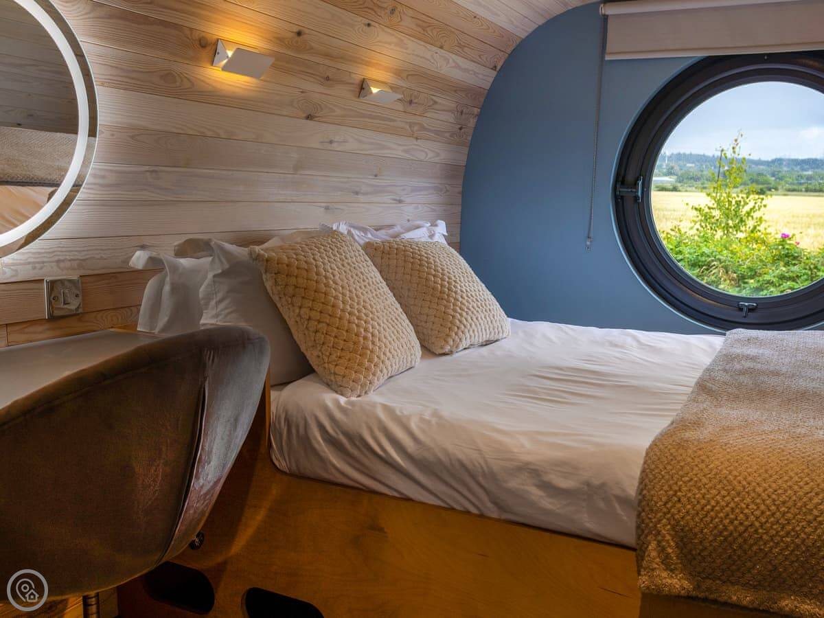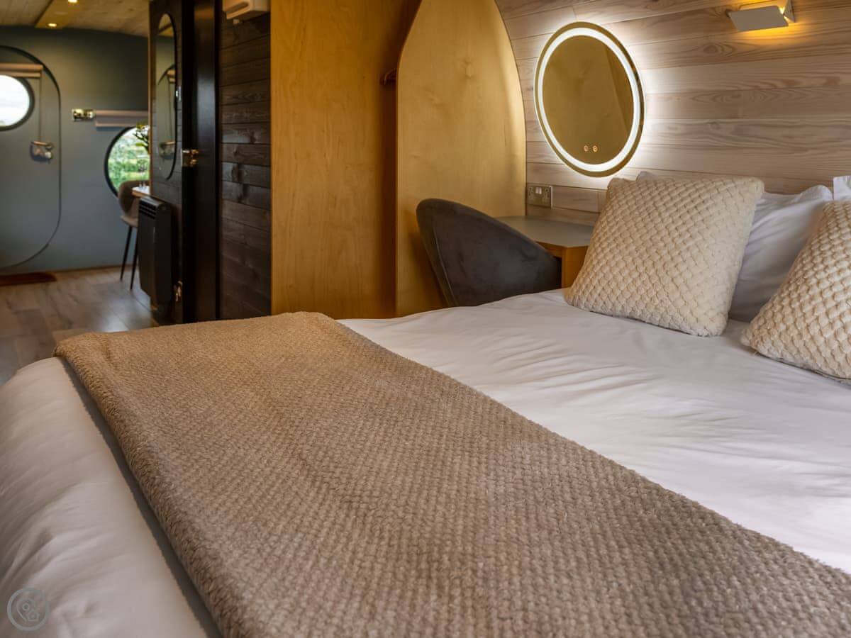 Whitewisp is on our land in Kennet, in Clackmannanshire. It's a timber pod, on its own, with a gravel spot for your car right next to it.
