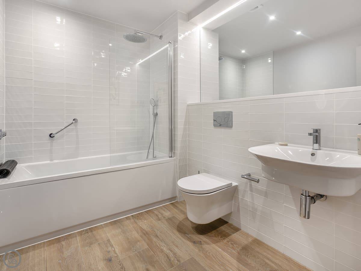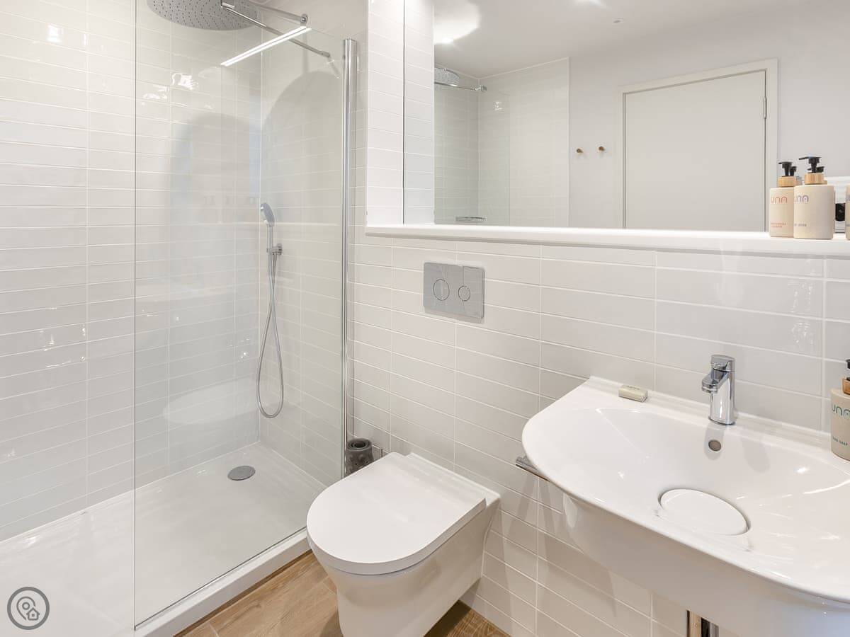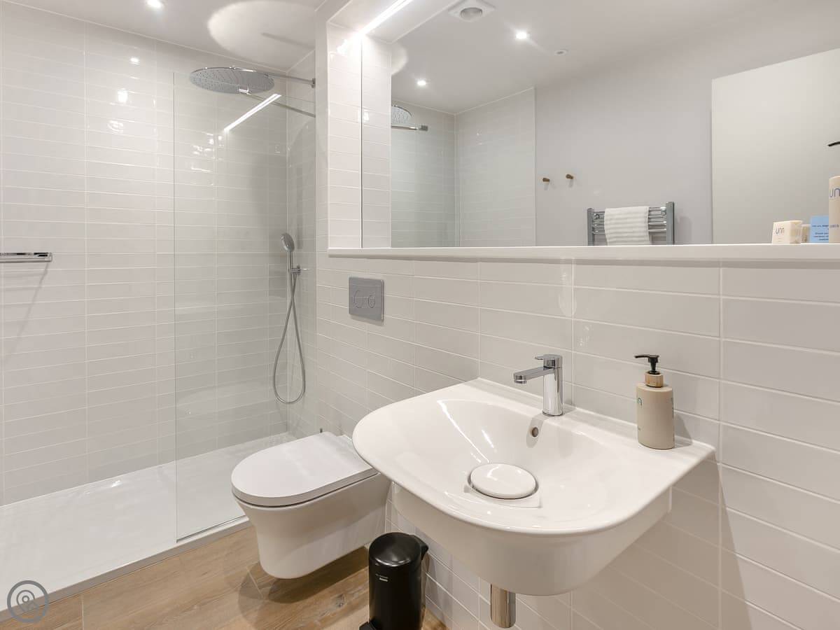 It's got four bedrooms and three bathrooms, all on the ground floor. That's handy. The stairs are oak and go up to the main living area, which is open plan. The kitchen's along one wall, and there's a big living area with doors out to a balcony. Two bedrooms have access to a patio as well. It's a well-thought-out layout.