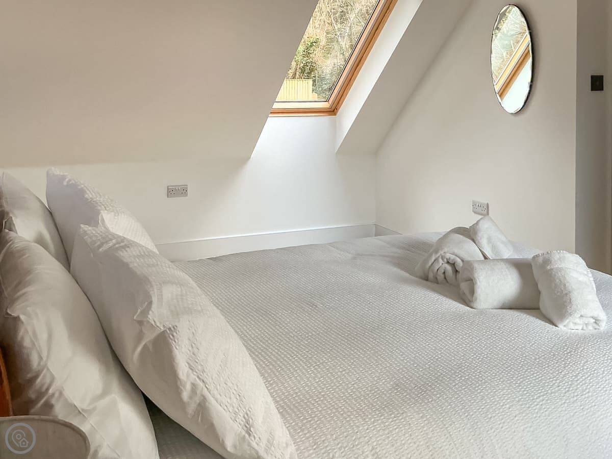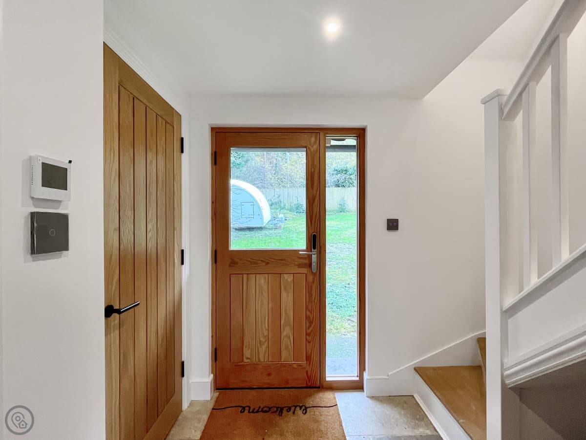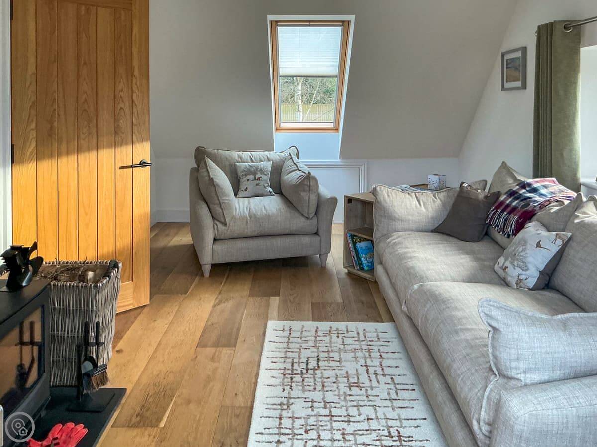 You go down four steps from the parking area into the kitchen-diner. That opens straight out to the garden. The garden wraps around a bit, with seating, and looks out over a paddock. We sometimes see deer. Upstairs, the main bedroom has a king-size bed and its own shower room. The other room has a bunk bed and a pull-out single bed, which is useful for kids. The living room has a wood burner and a smart TV. There's a Velux window that opens onto a small balcony overlooking the paddock.