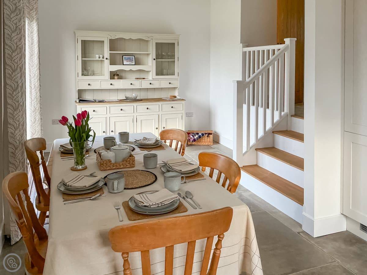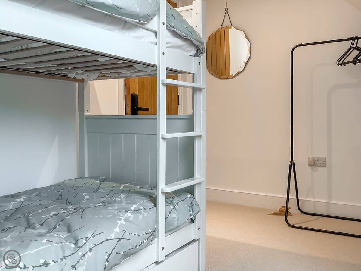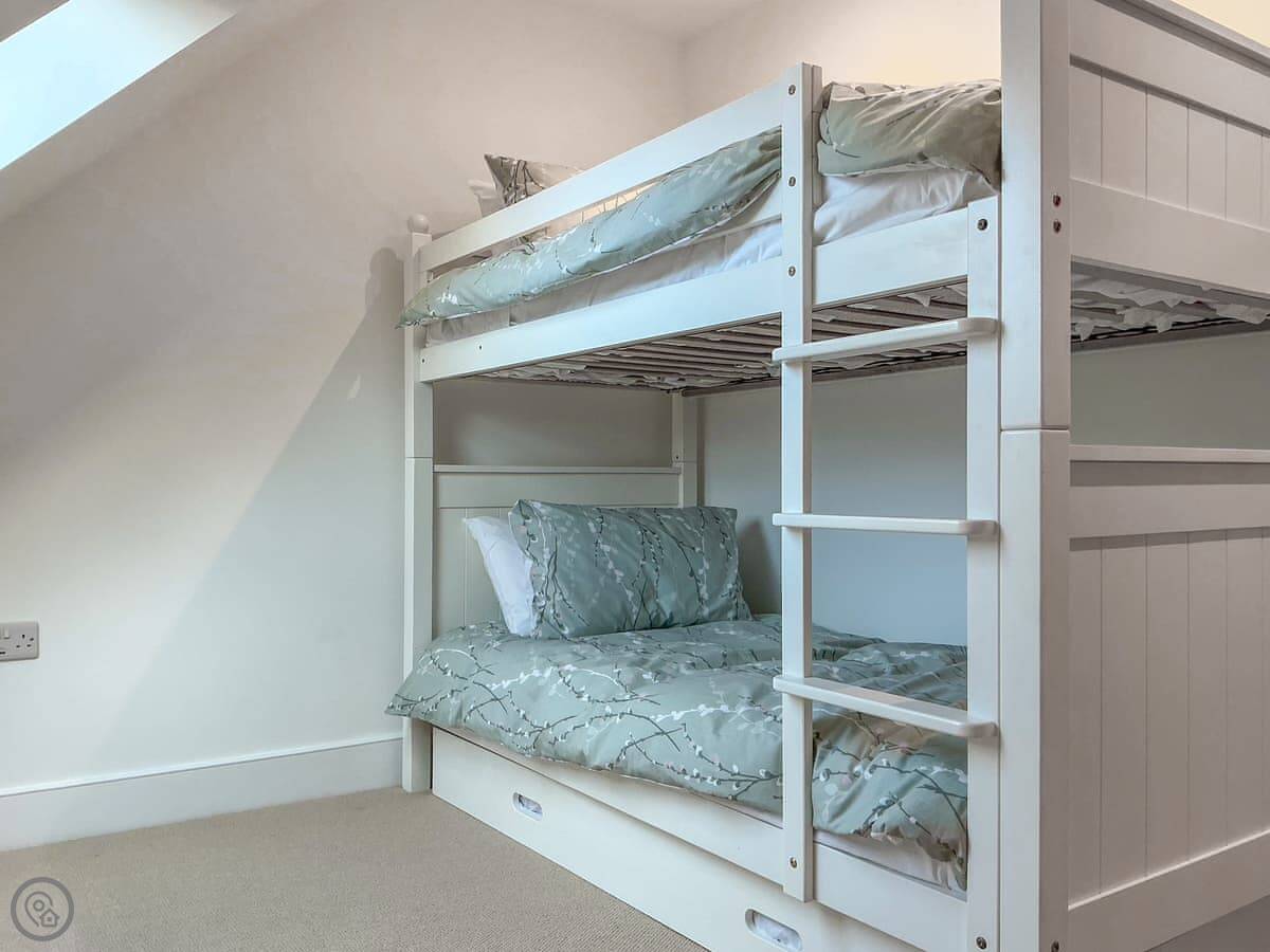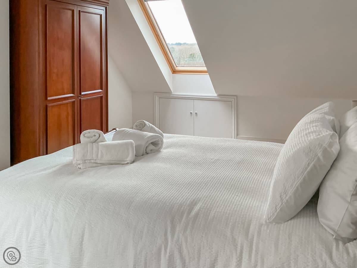 You go down four steps from the parking area into the kitchen-diner. That opens straight out to the garden. The garden wraps around a bit, with seating, and looks out over a paddock. We sometimes see deer. Upstairs, the main bedroom has a king-size bed and its own shower room. The other room has a bunk bed and a pull-out single bed, which is useful for kids. The living room has a wood burner and a smart TV. There's a Velux window that opens onto a small balcony overlooking the paddock.