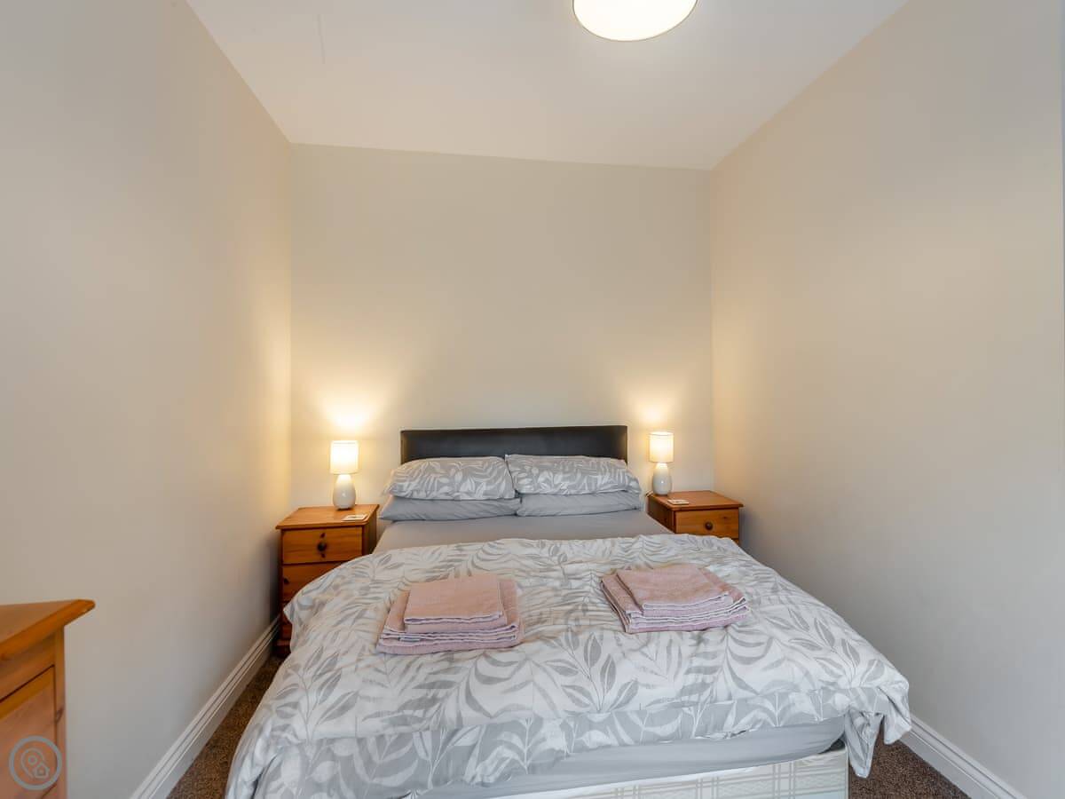 The living area is open plan. It's got a kitchenette, a sofa, a table, and the bed's through an archway. There's a TV and WiFi. The shower is a walk-in one. All the bedding and towels are here for you. Parking is right outside.