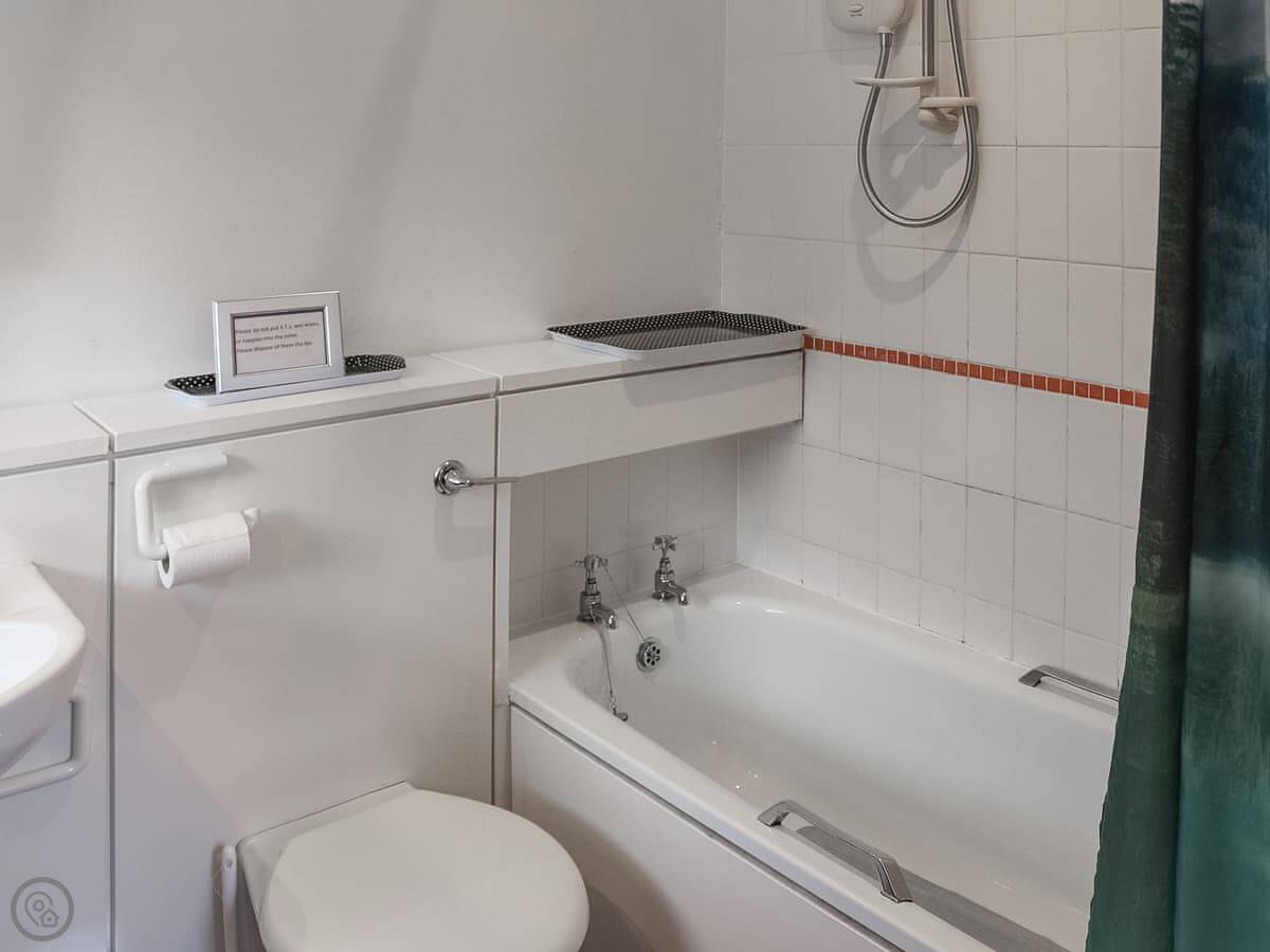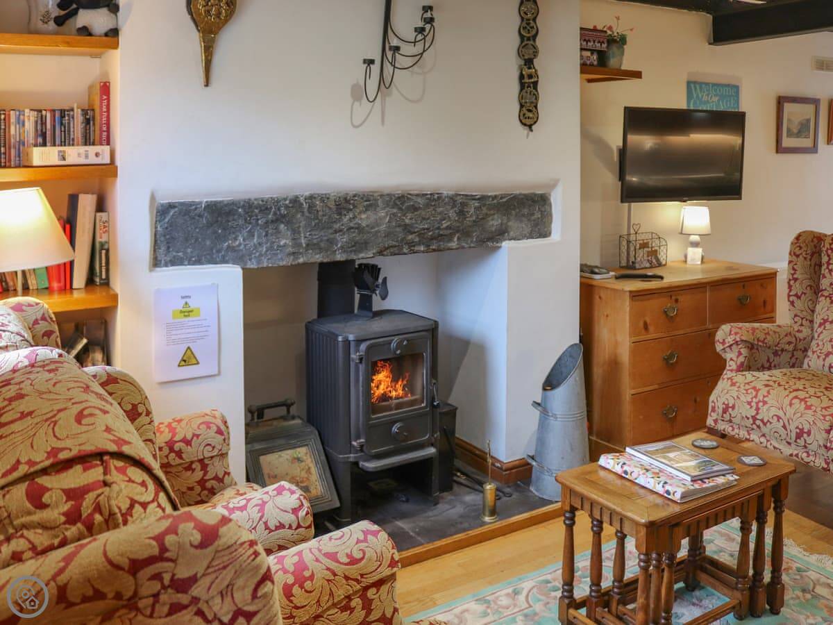 Inside, it's open plan downstairs. There's a multi-fuel stove. The kitchen has a dishwasher. Everything you'd need is included: bedding, towels, WiFi. Parking is on site.