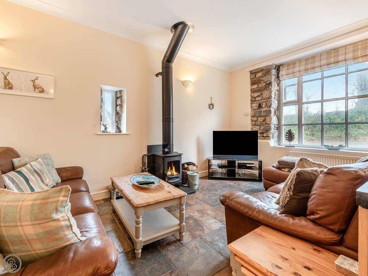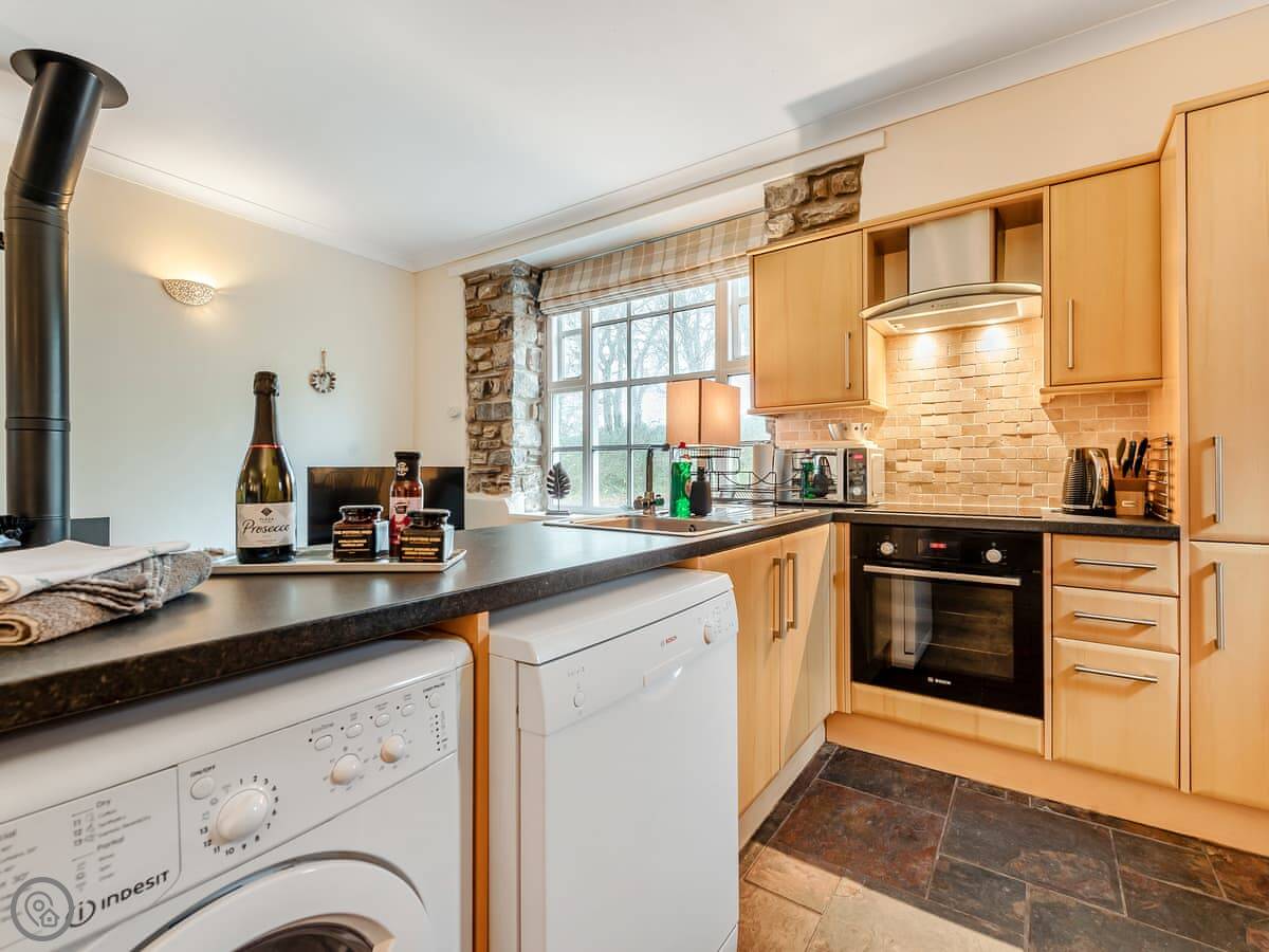 Inside, it's open plan with a wood burning stove. There's a TV, a games console, and wifi. The kitchen has a dishwasher and washing machine. Bedding and towels are provided.