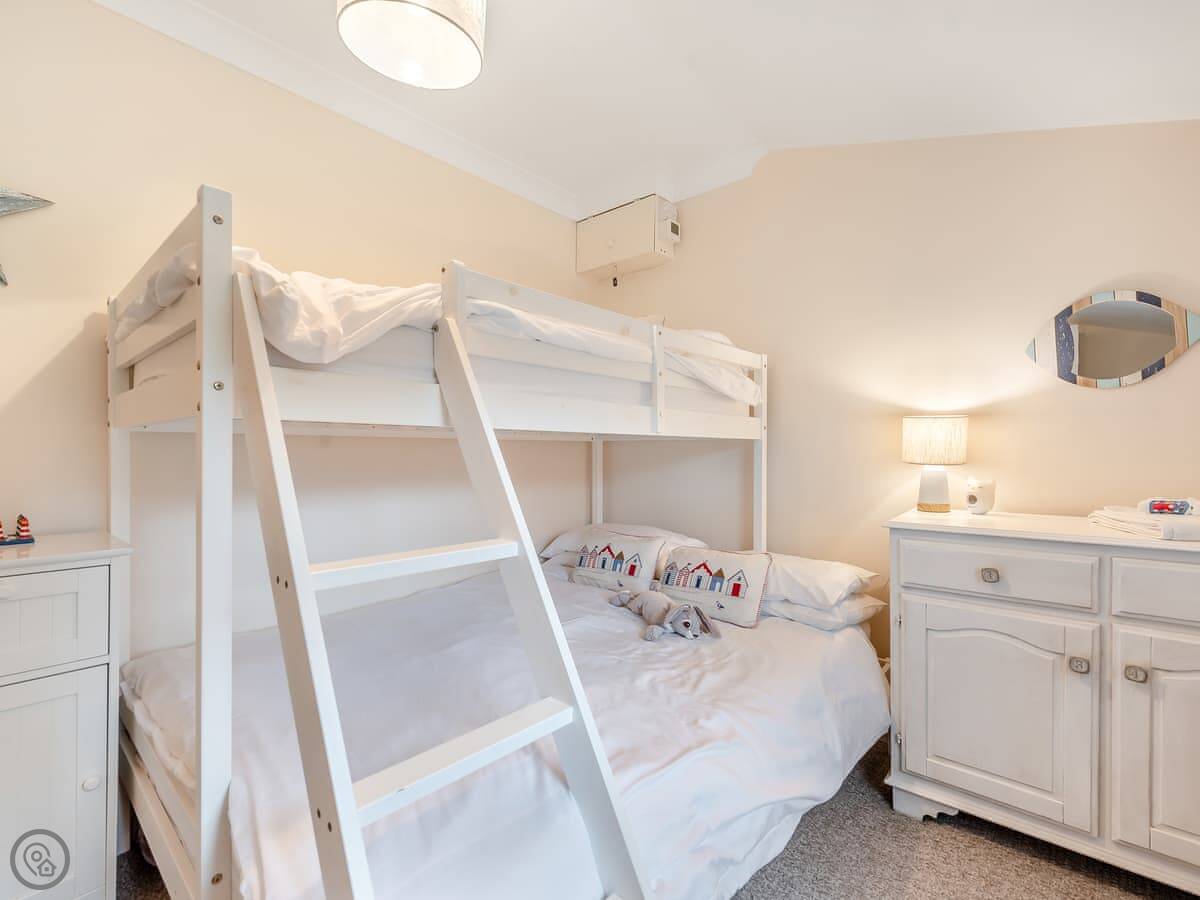 It sleeps six. Three bedrooms, one bathroom. It's got a 4 Star rating. One room has a triple bunk, good for kids. The main bedroom has a super king bed that can be split into two singles if you need it. It's all on one level, so no stairs.