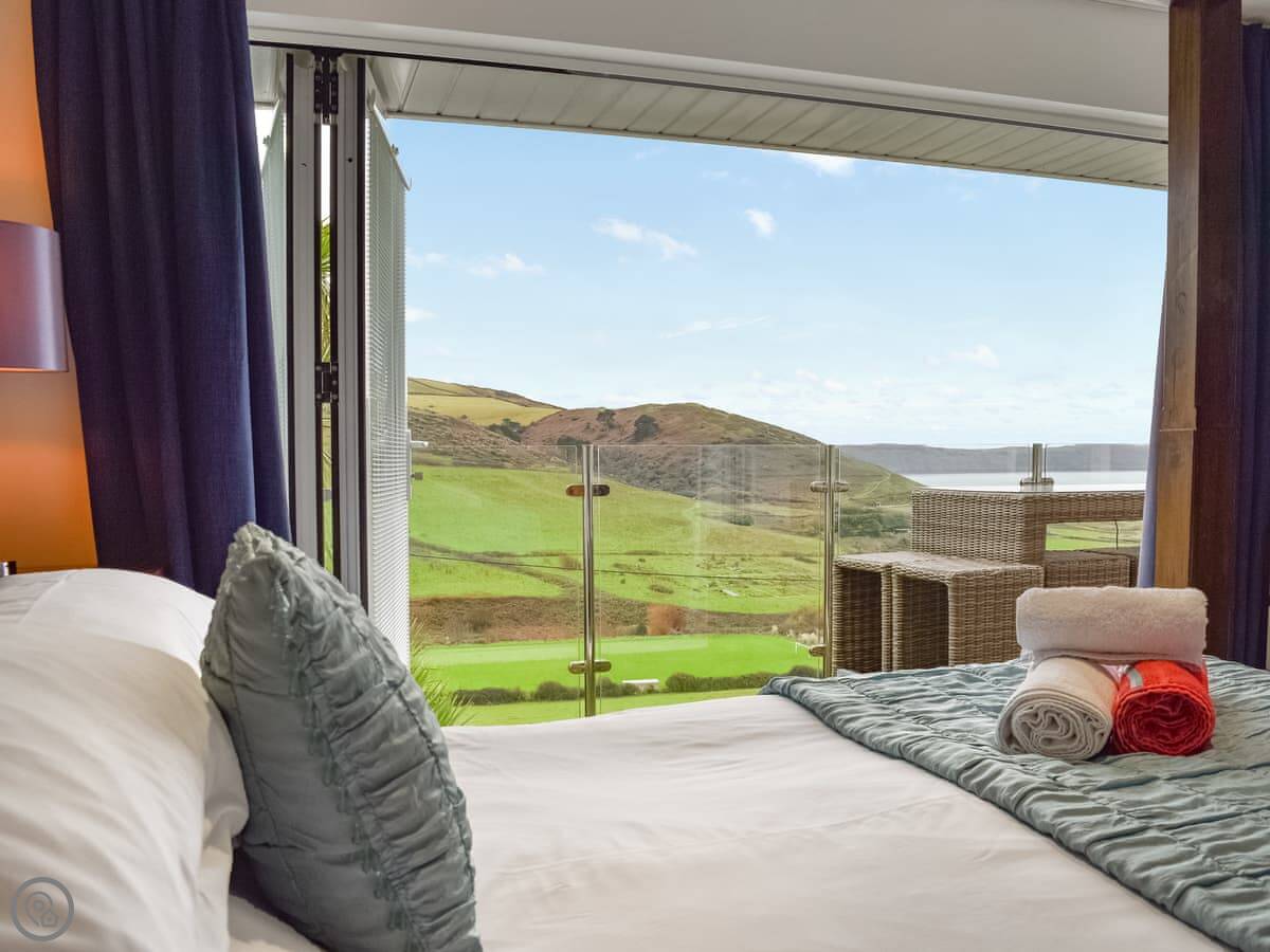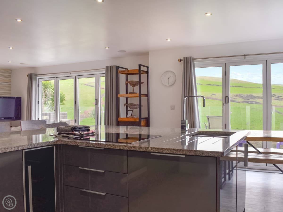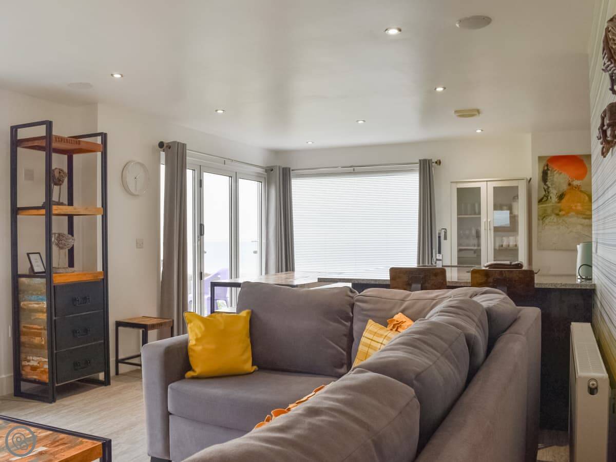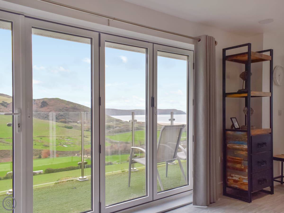 The living area is all open plan. Big doors open onto the balcony. The view is the main thing. You look right out over Woolacombe Bay and the sea. On a clear day you can see Lundy Island.