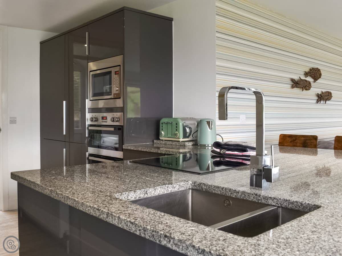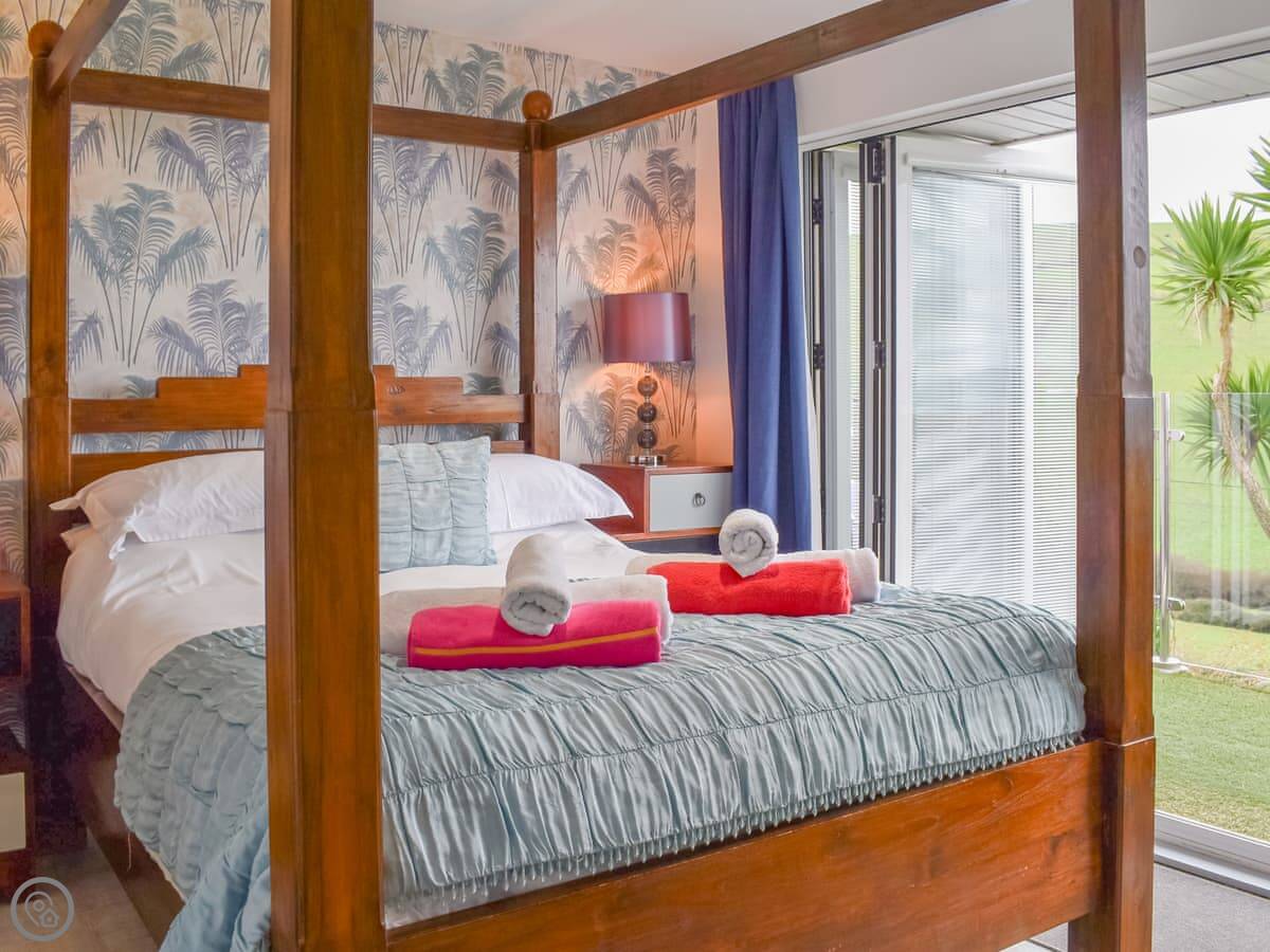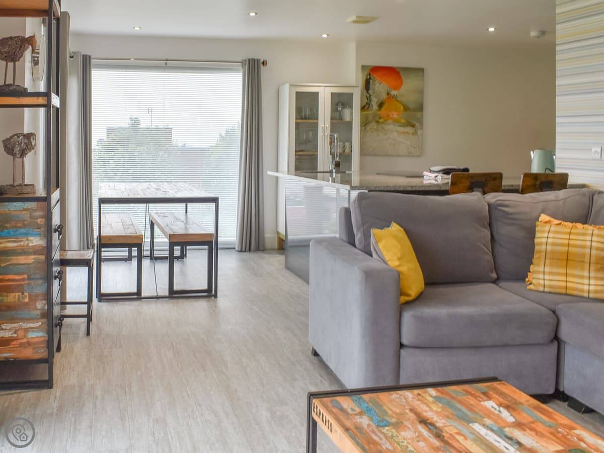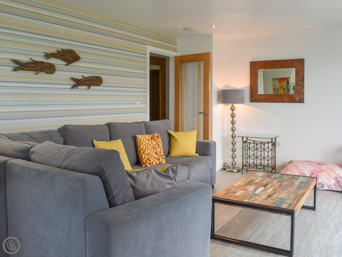The living area is all open plan. Big doors open onto the balcony. The view is the main thing. You look right out over Woolacombe Bay and the sea. On a clear day you can see Lundy Island.