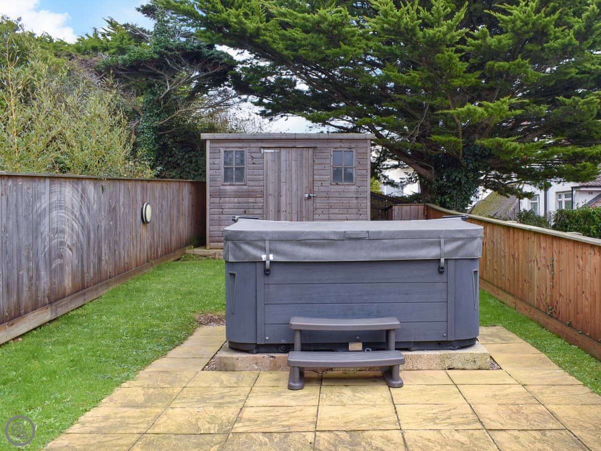 Outside, there's a balcony at the front. Round the back, more steps lead down to a private garden area with a hot tub. The view from there is even better.