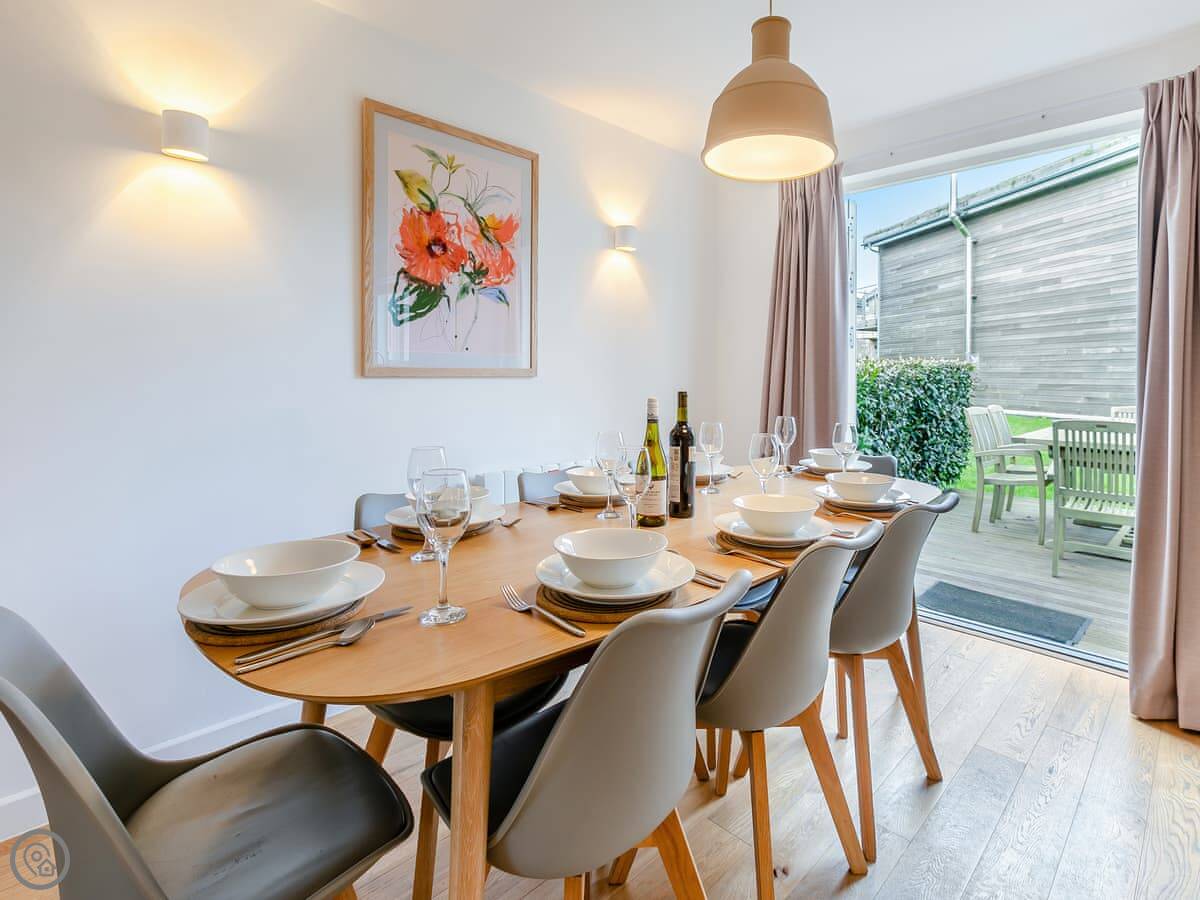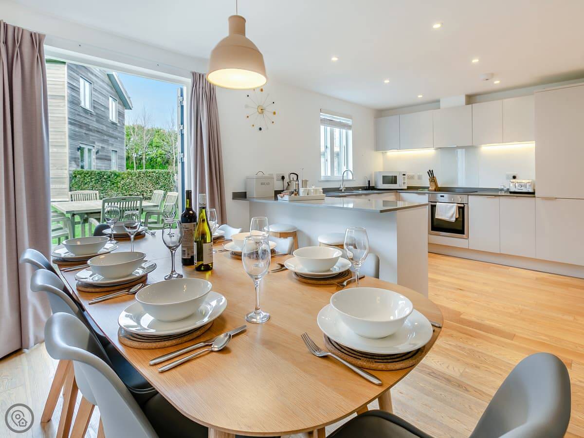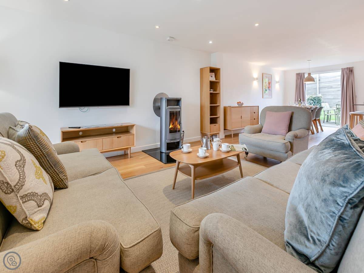 The main room is open plan, kitchen, living and dining area together. There's a wood burner for cooler evenings. The set-up is modern and clear. Everything's included: bedding, towels, WiFi.