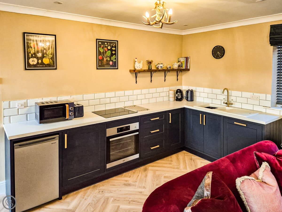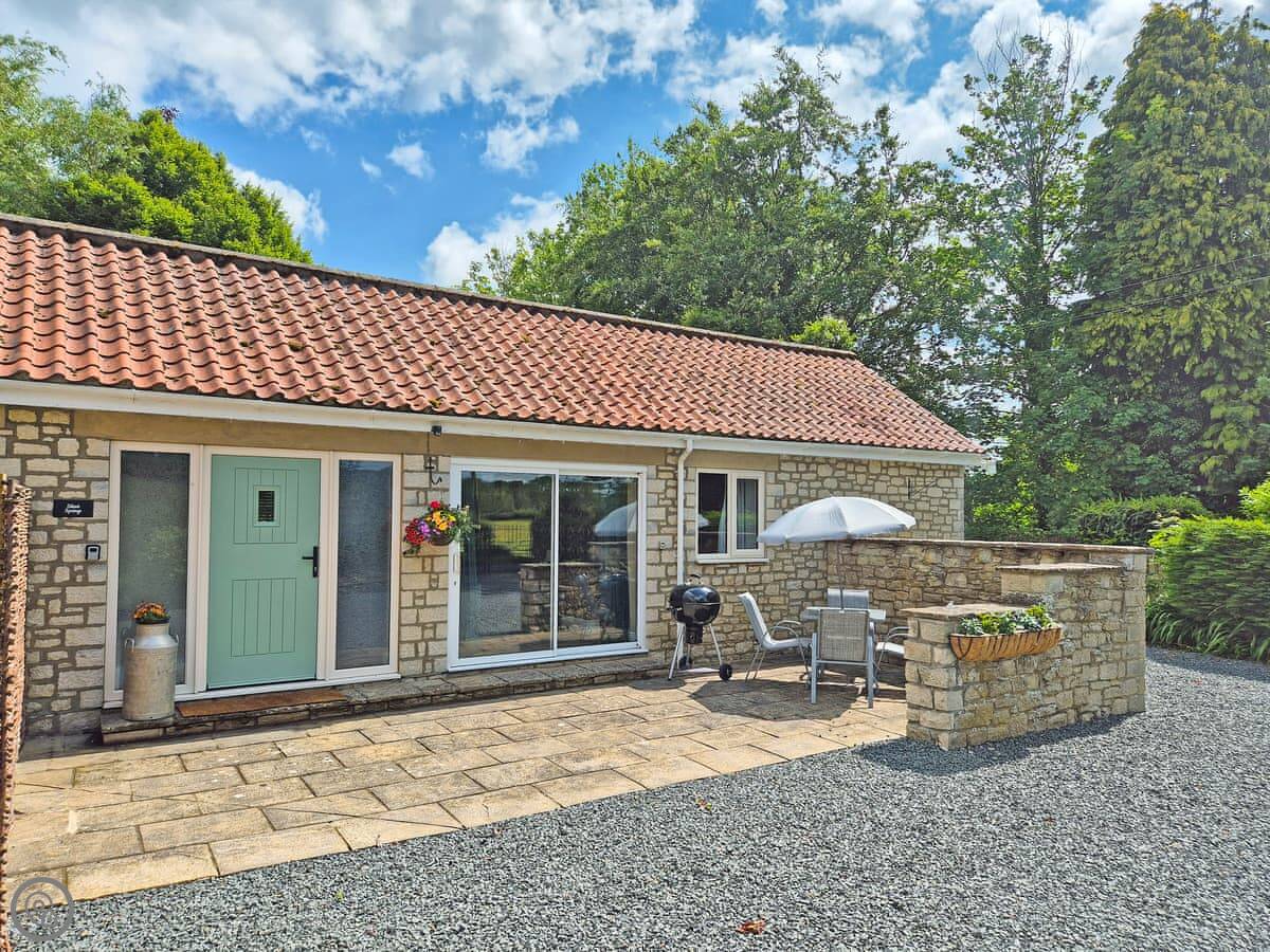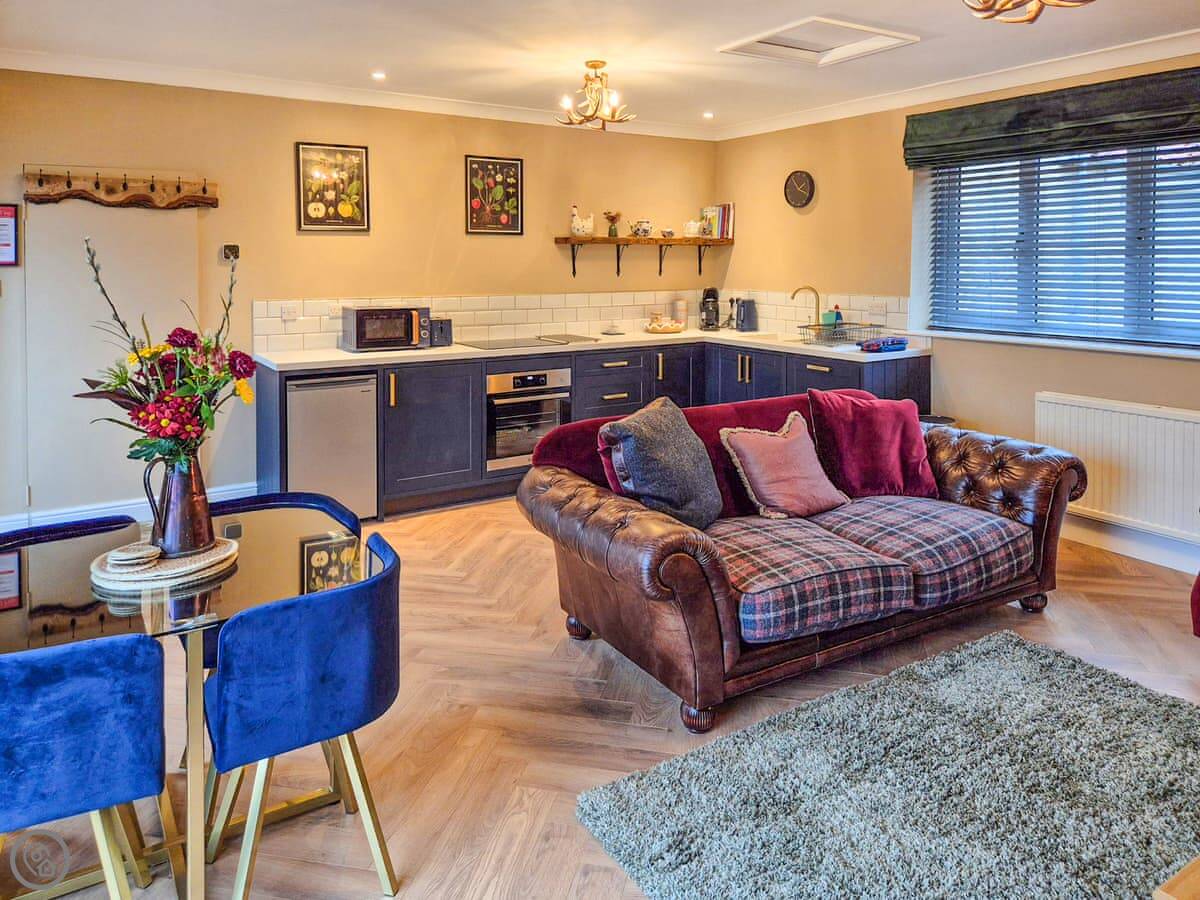 It's a barn conversion, sleeps four. There's one large bedroom and one bathroom. It's got a 4 Star rating. The main room is open plan, kitchen and living area together. There's a TV and Wi-Fi. Patio doors open out to an enclosed garden.